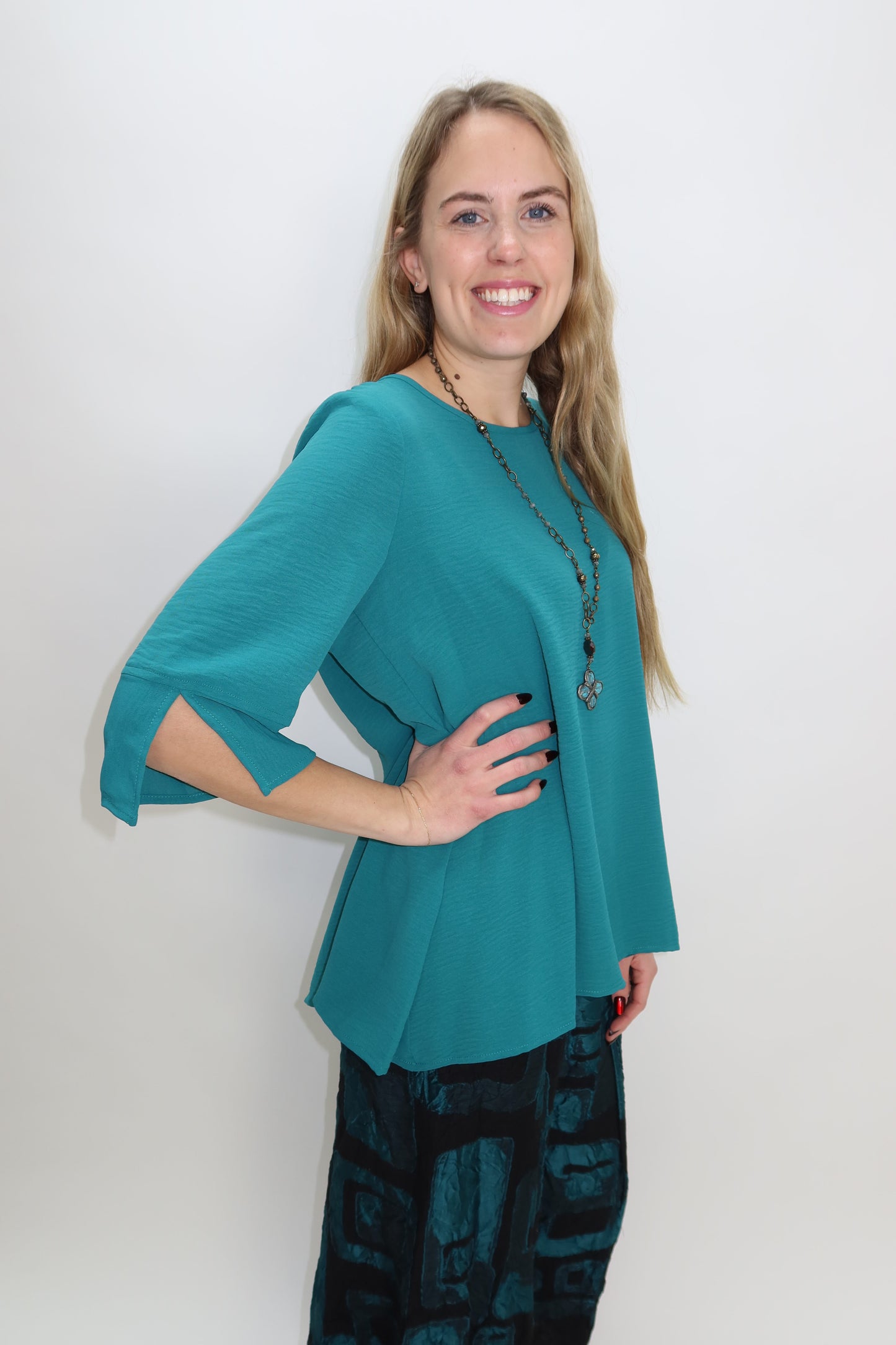Slip into effortless comfort with this Jade Teal Air Flow Bell Sleeve Tunic. Crafted from our signature super soft air flow fabric, it keeps you cool and comfortable all day long. The charming bell sleeves add a touch of feminine flair, while the relaxed shirt tail hem creates a flattering, versatile silhouette perfect for pairing with your favorite jeans or leggings. A wardrobe essential that feels as good as it looks.