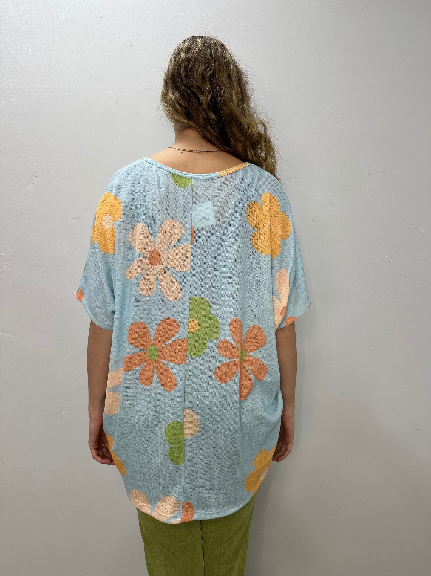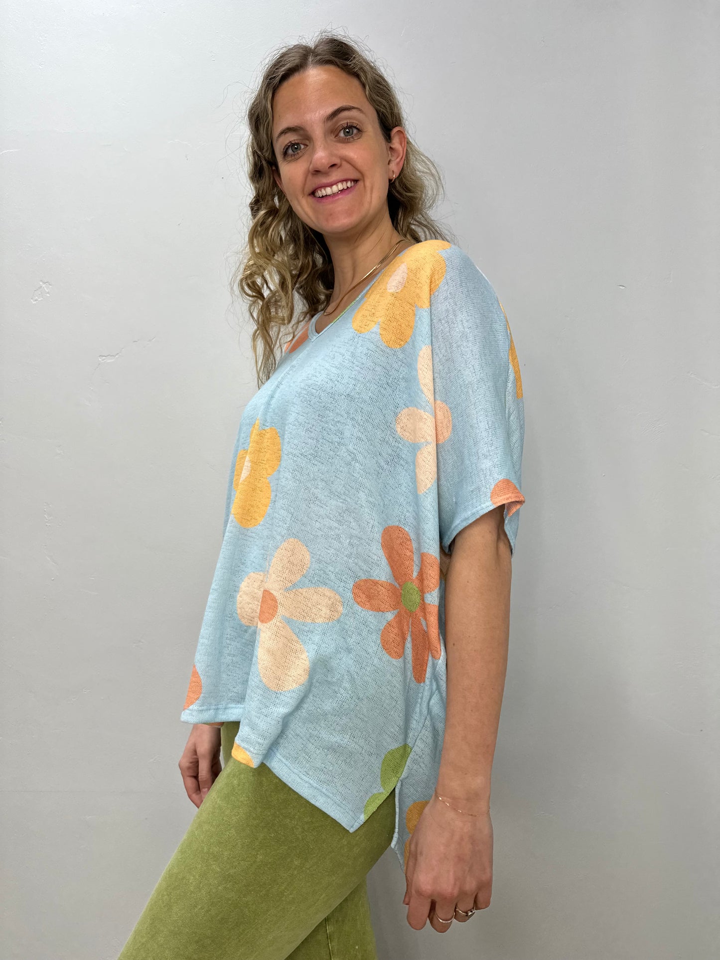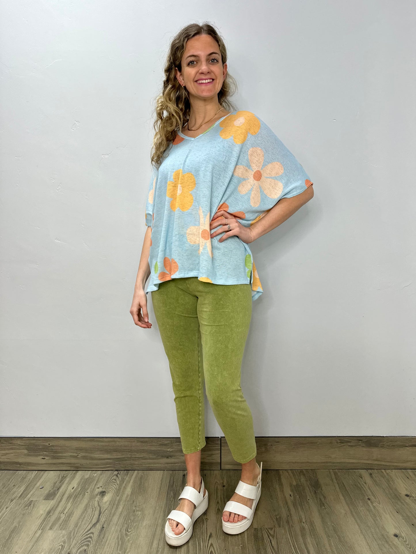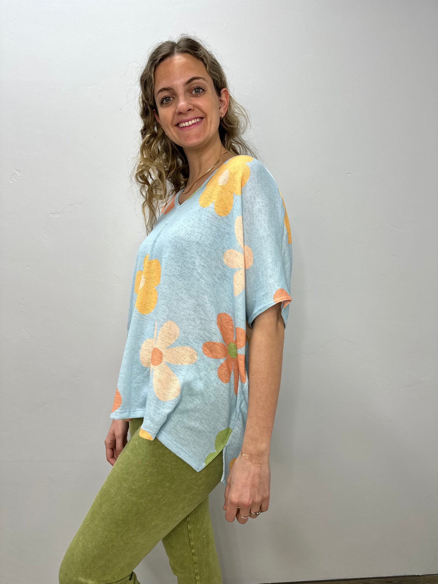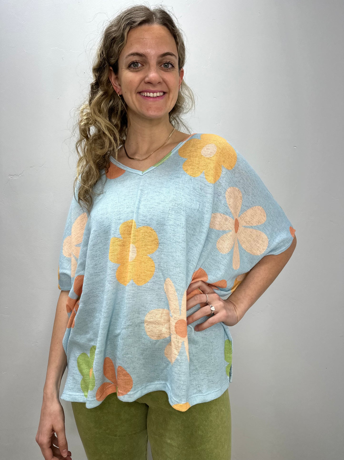 Light Blue Daisy Knit V-Neck Dolman Sleeve Top