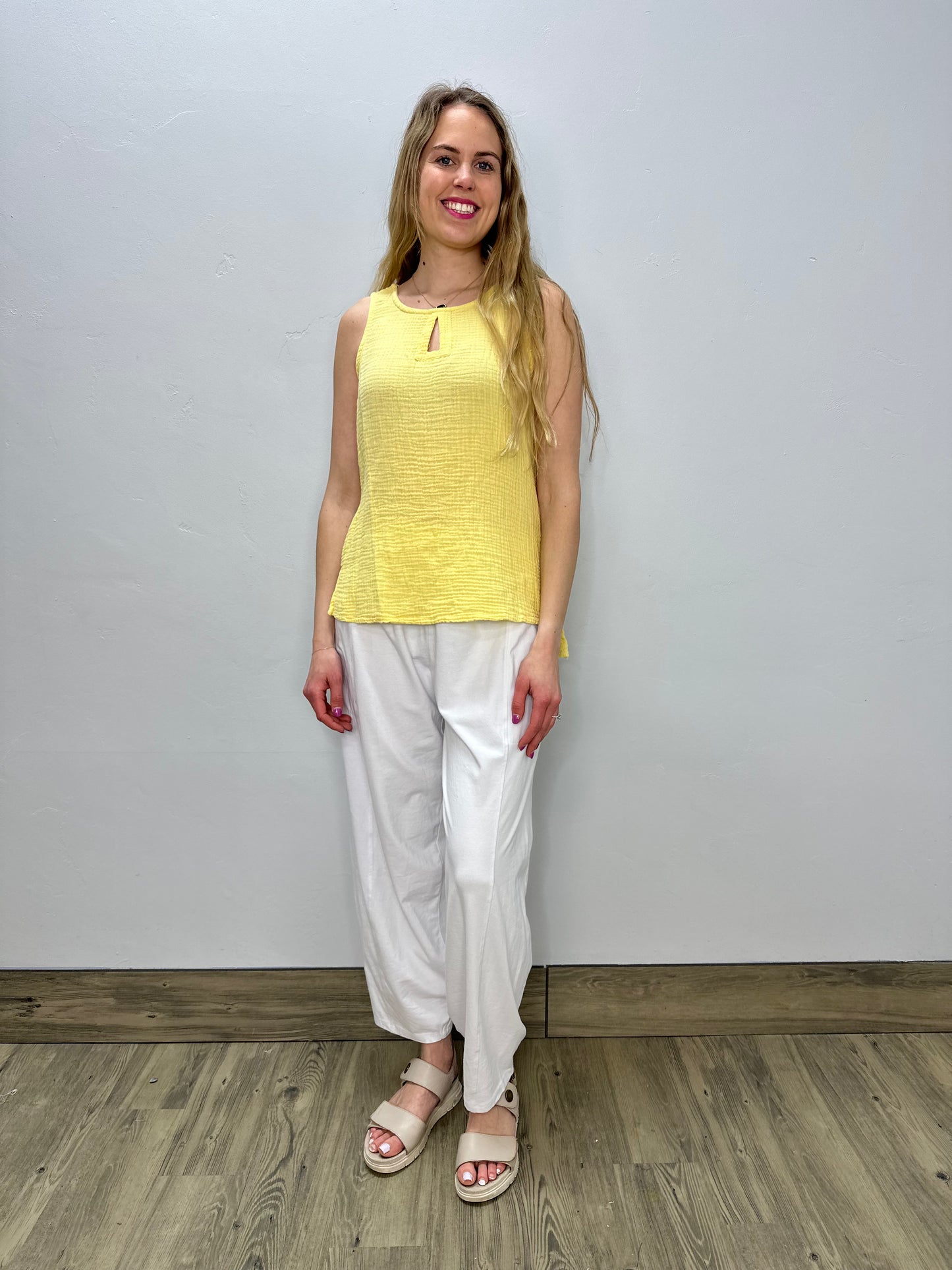 This Marigold Yellow Pin Tuck Sleeveless Cotton Top is made from 100% cotton, making it super soft to the touch. The front pleat adds a stylish detail to this versatile and comfortable top. Perfect for any occasion, from casual outings to dressy events.