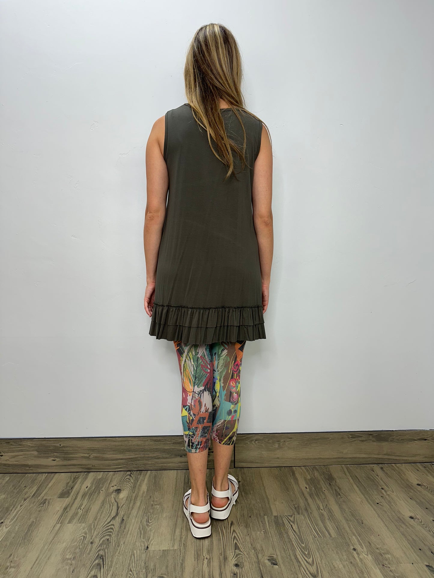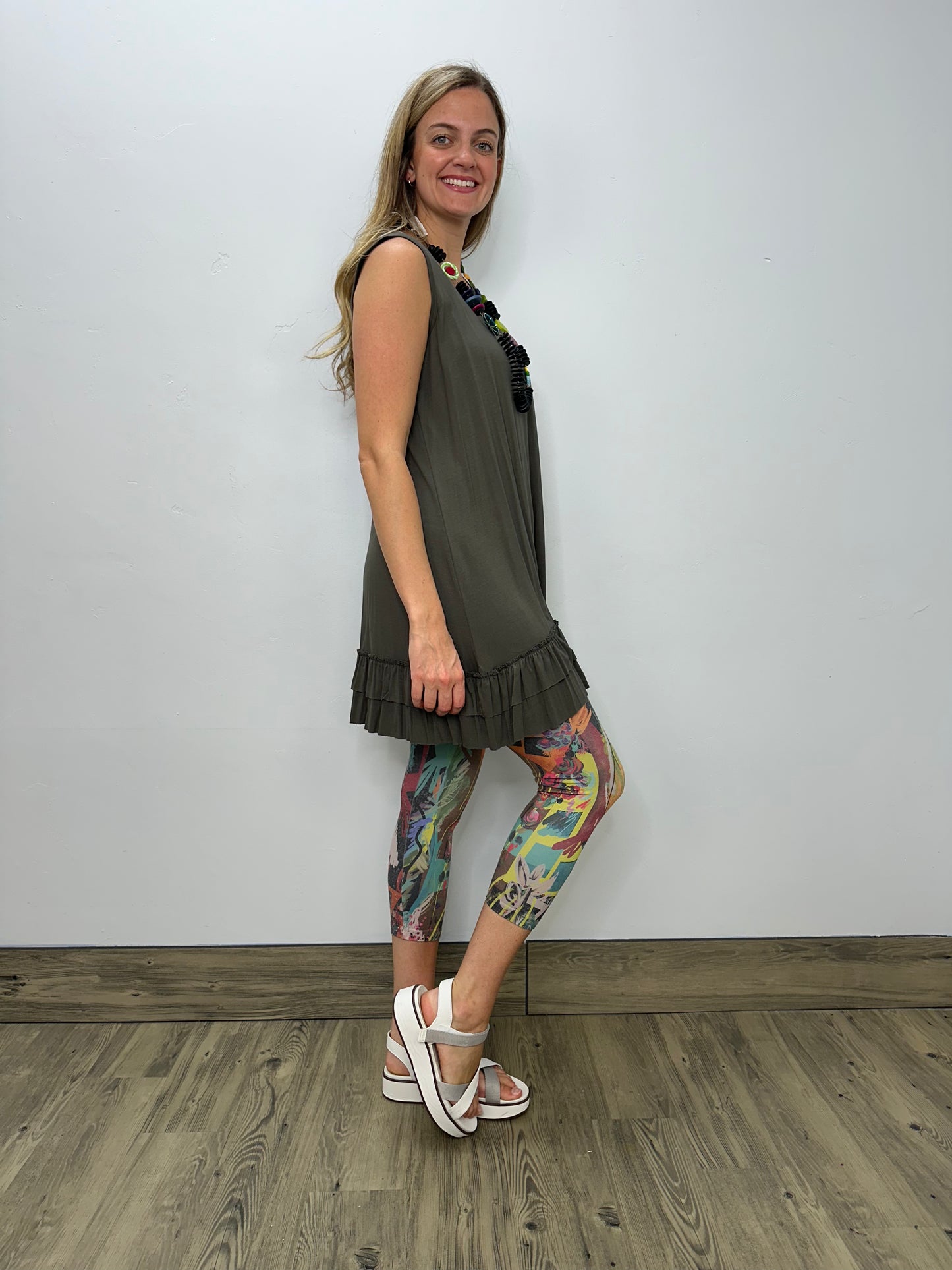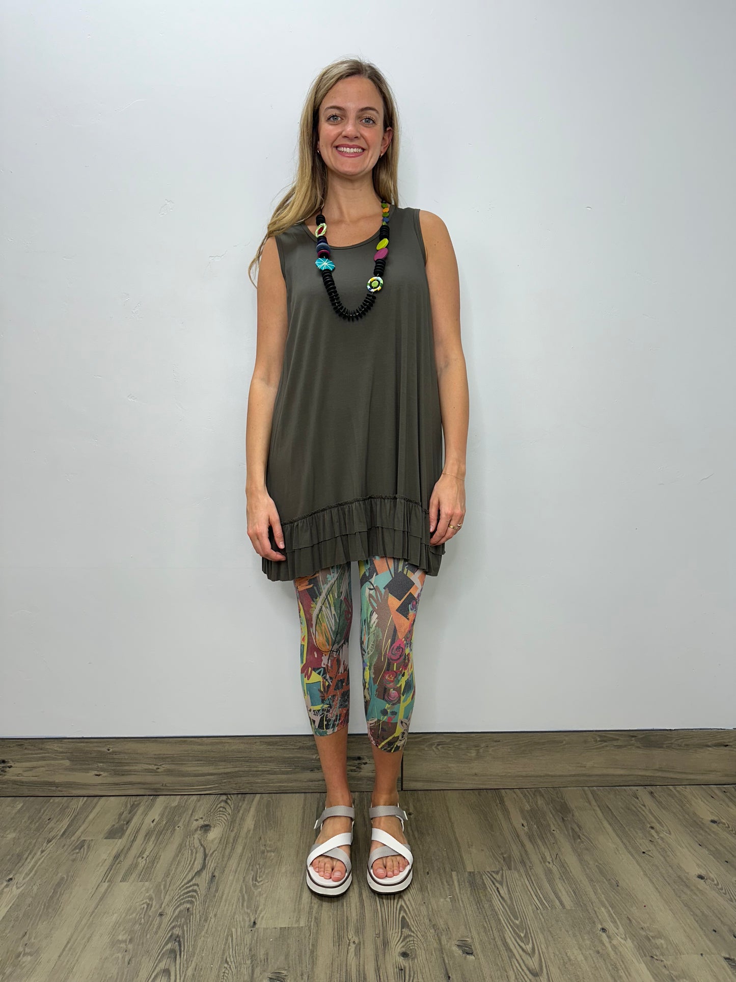 This Twist designed double ruffle hem adds dimension and distinction to your outfit. The soft modal fabric wraps you comfortably regardless of your activity. Add some length to your shorter tops and pair perfectly with our wide selection of printed M. Rena leggings.