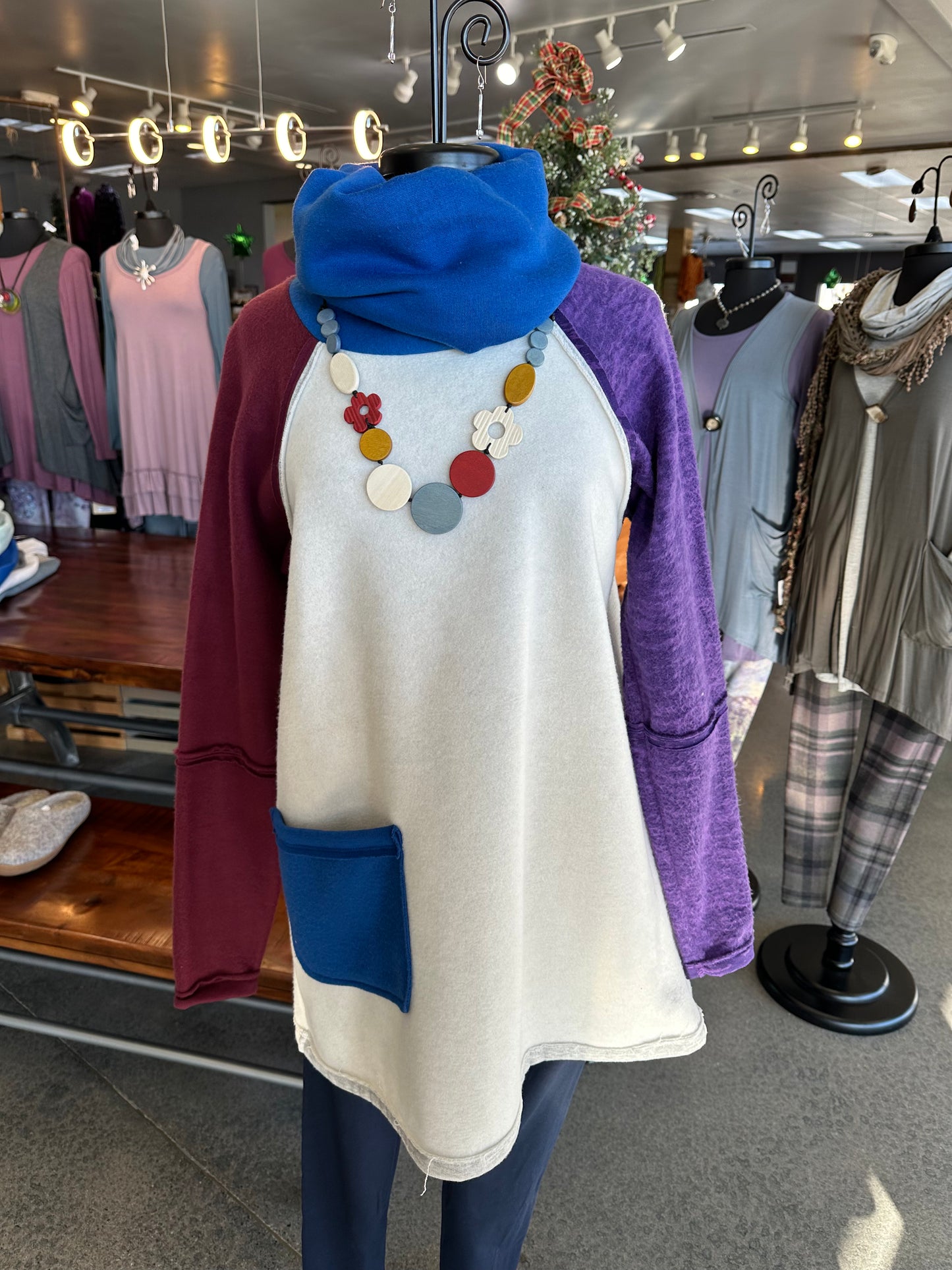 Designed by Twist Boutique owner Trish, the new Colorado flaunts a generous funnel neck that easily adjusts to your desired style to stay warm and cozy this season! Contrast raw seams and a right side patch pocket create added interest. Five inch sleeve cuffs allow you to roll them up to the look and length you prefer. Inside you'll find ultra soft fleece that keeps you comfy and cozy.
