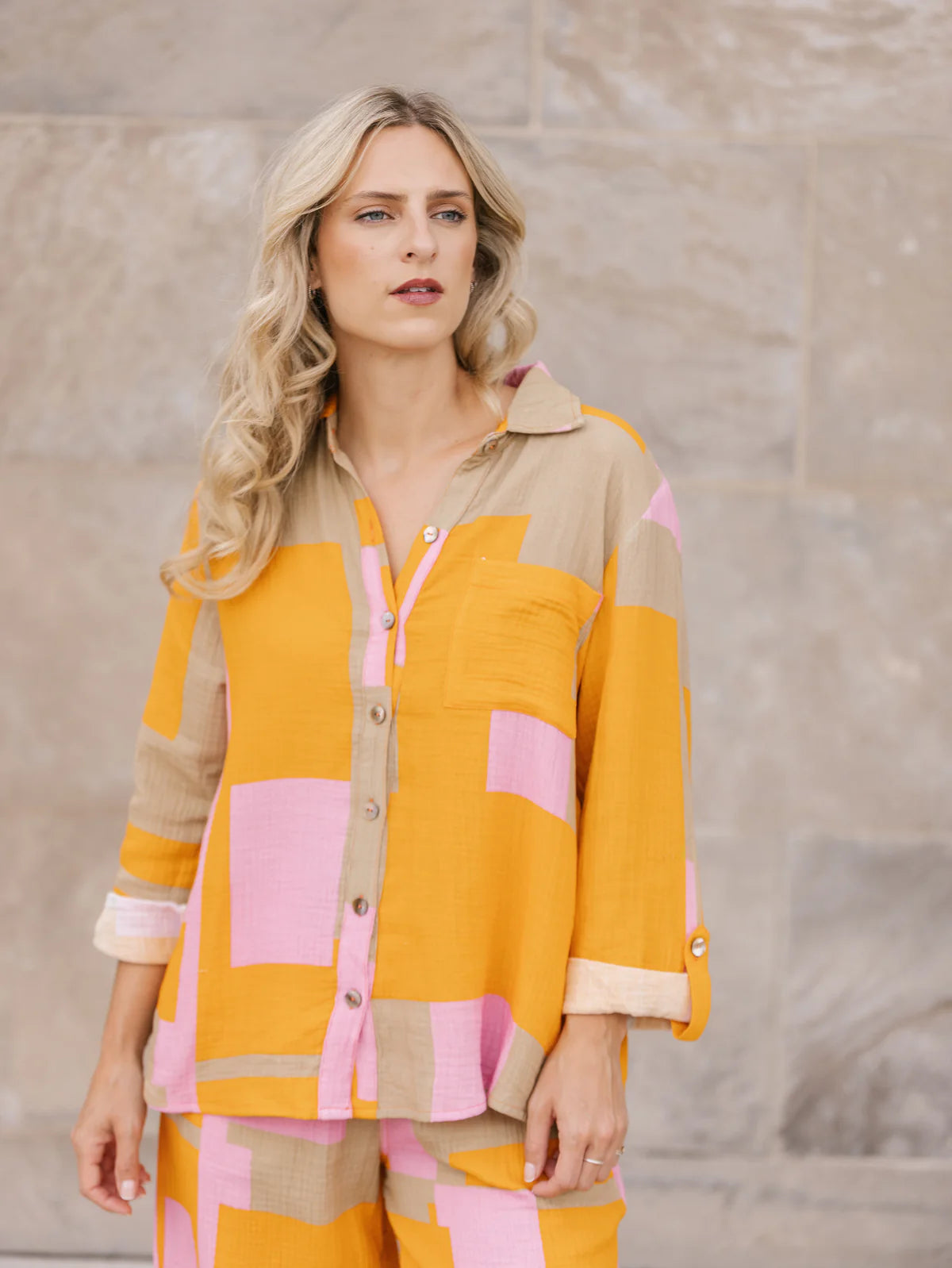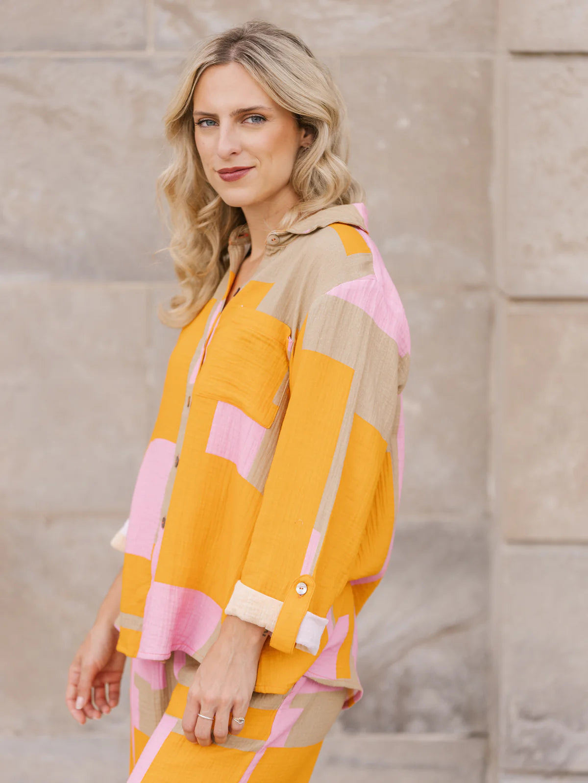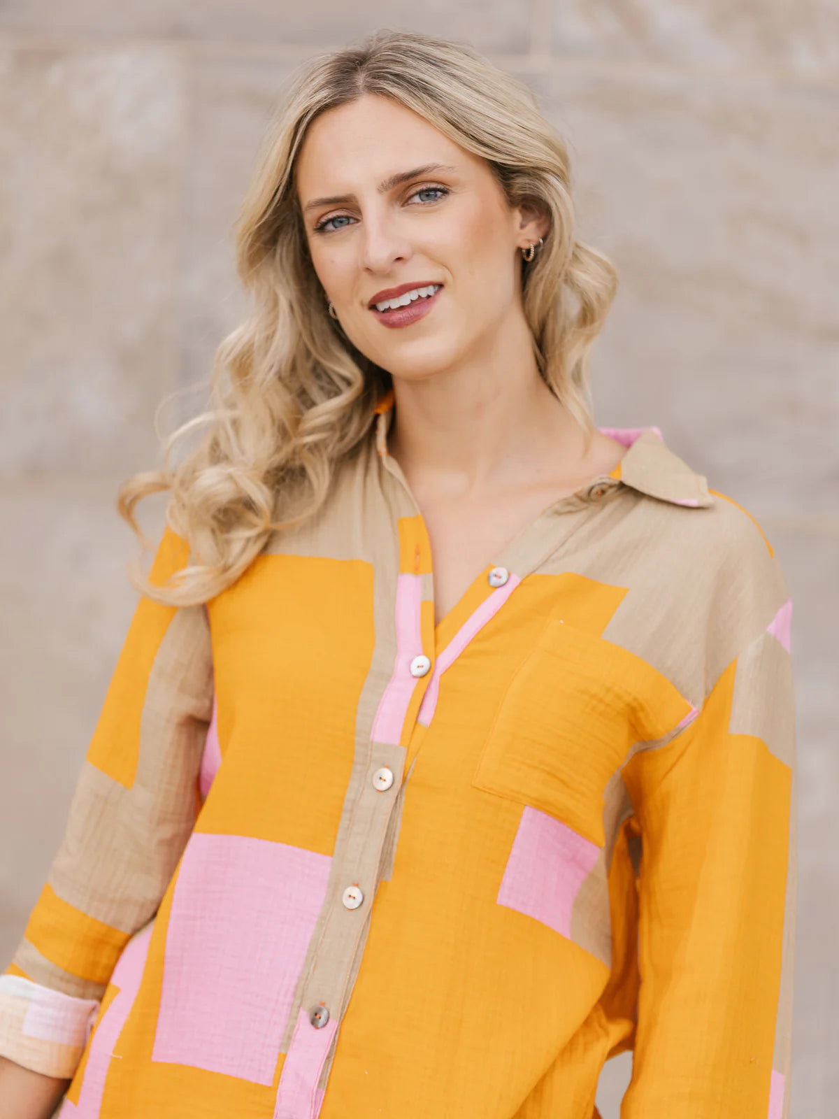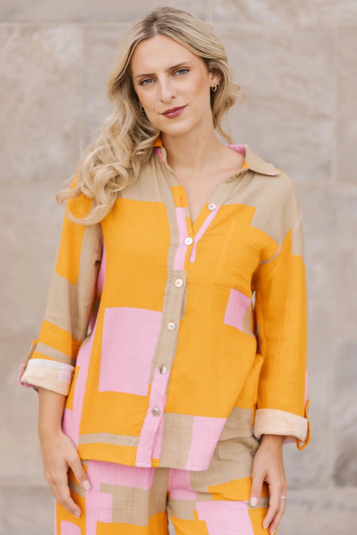 Orange Pink and Tan Cotton Gauze Button Up Top
