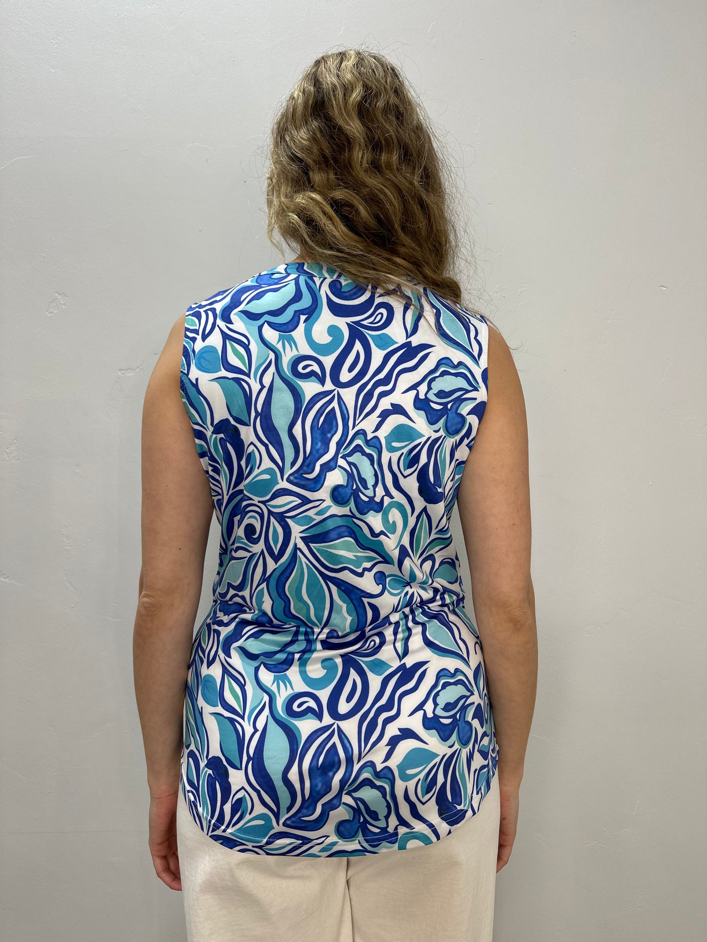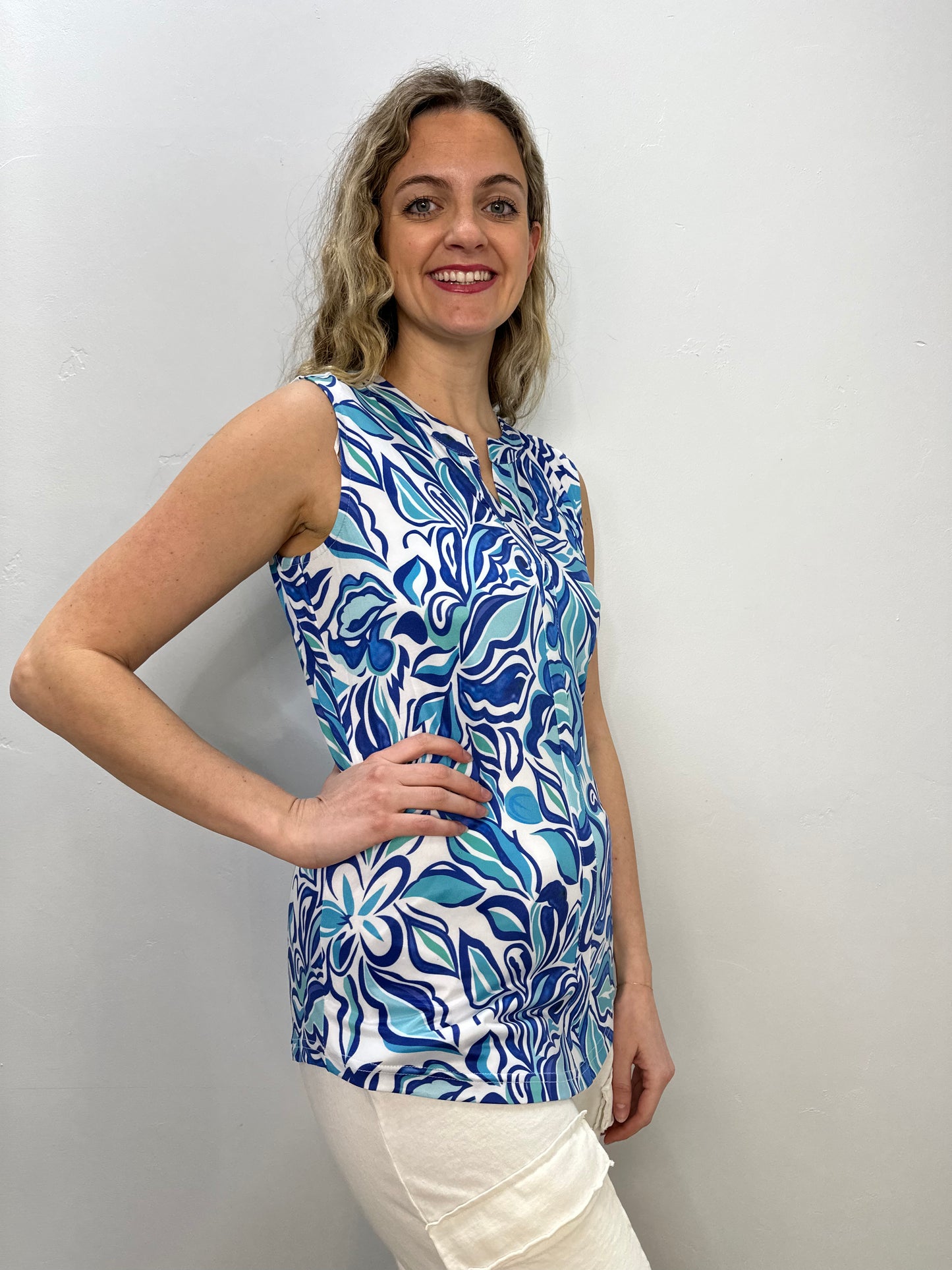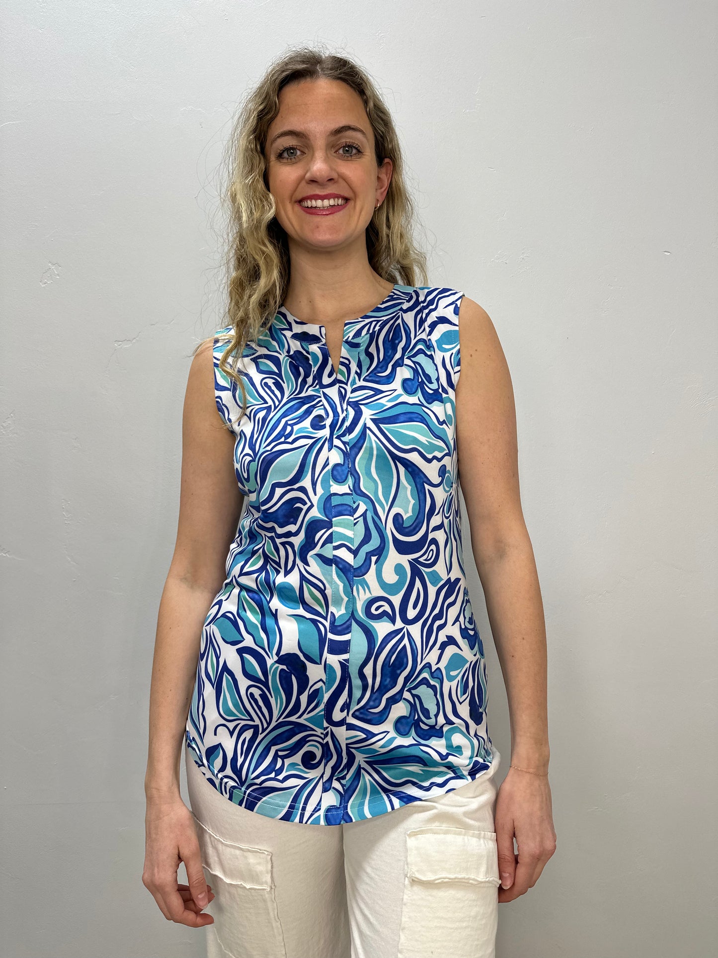 Regular price $55.20Stay stylish and protected in our Pattern Sleeveless Split V Neck Top. With its UPF 50 rating, you can feel confident in the sun. The comfortable, sleeveless design and 1/4 notch tank add an extra touch of versatility. Make a statement and elevate your wardrobe with this must-have piece!