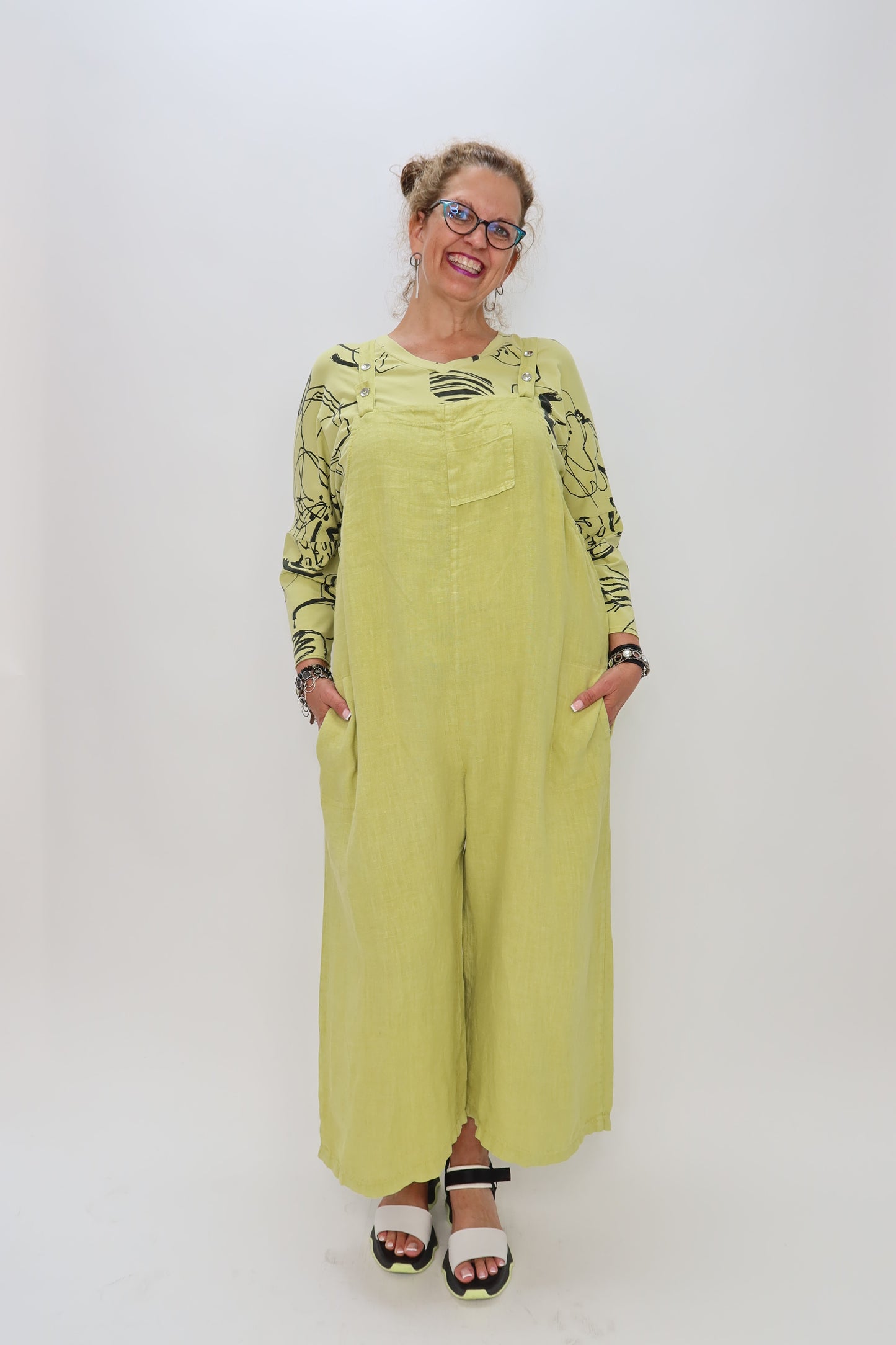 This Pistachio Green Linen Jumper Overall combines style and practicality with its charming front pocket and two convenient side pockets. Adjustable button closures on the straps ensure a perfect fit, while the full-length pants offer comfortable coverage for all-day wear. Ideal for effortless, chic layering, this jumper adds a fresh, versatile touch to your wardrobe.