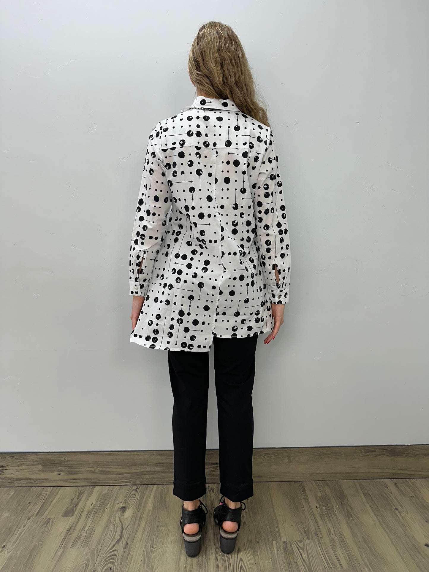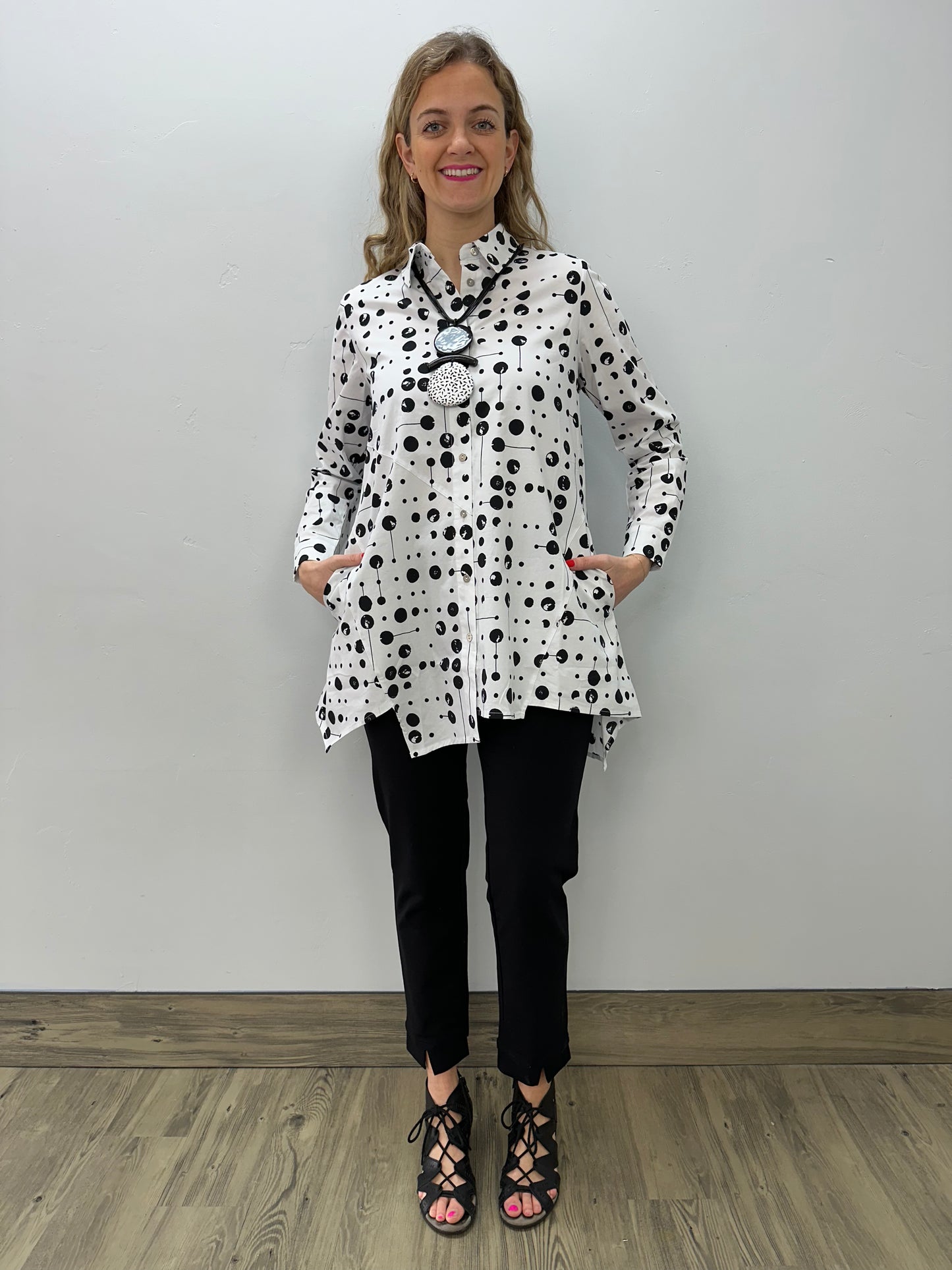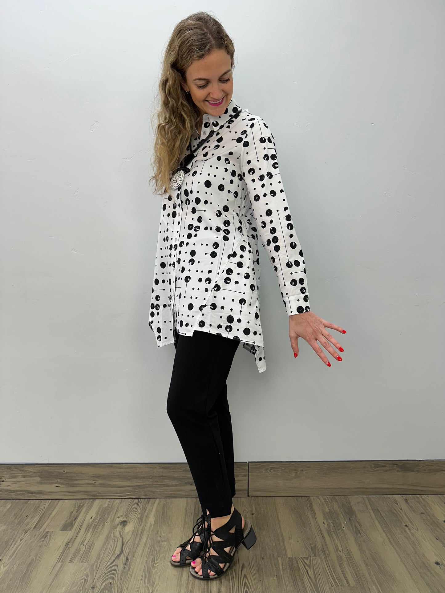 Get ready to spice up your wardrobe with our White Poppy Pepper Blouse! This adorable blouse features a black pepper pattern that adds a touch of playfulness to your look. It's long enough to pair with leggings for a comfortable and stylish outfit. Plus, the button-up design makes it a versatile piece for any occasion. Add some flavor to your wardrobe today!