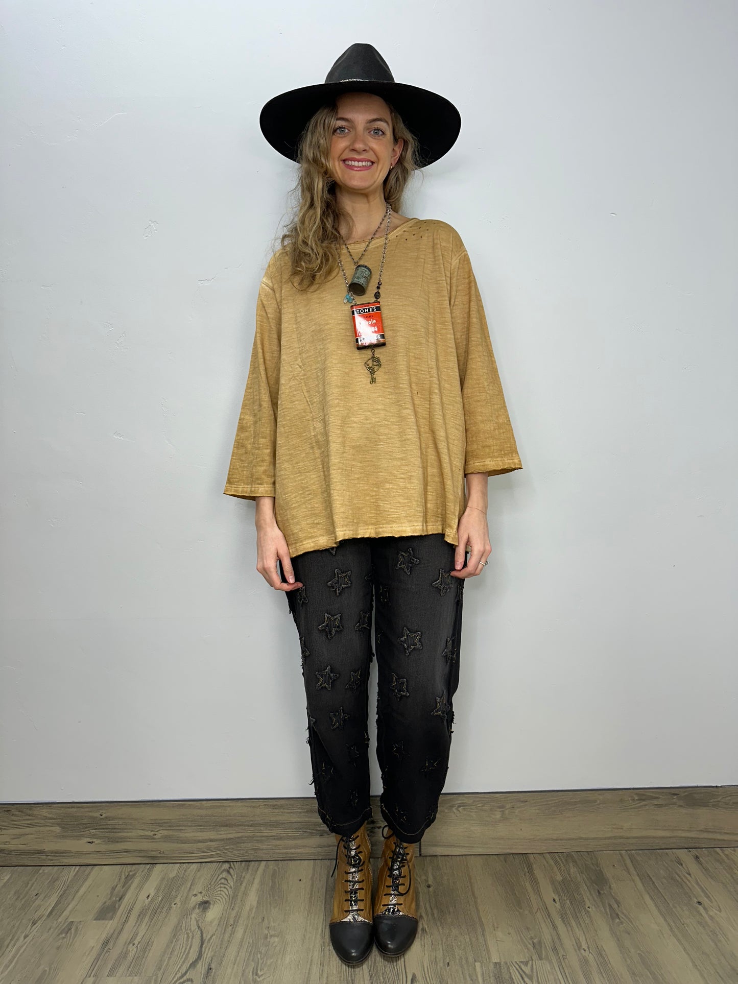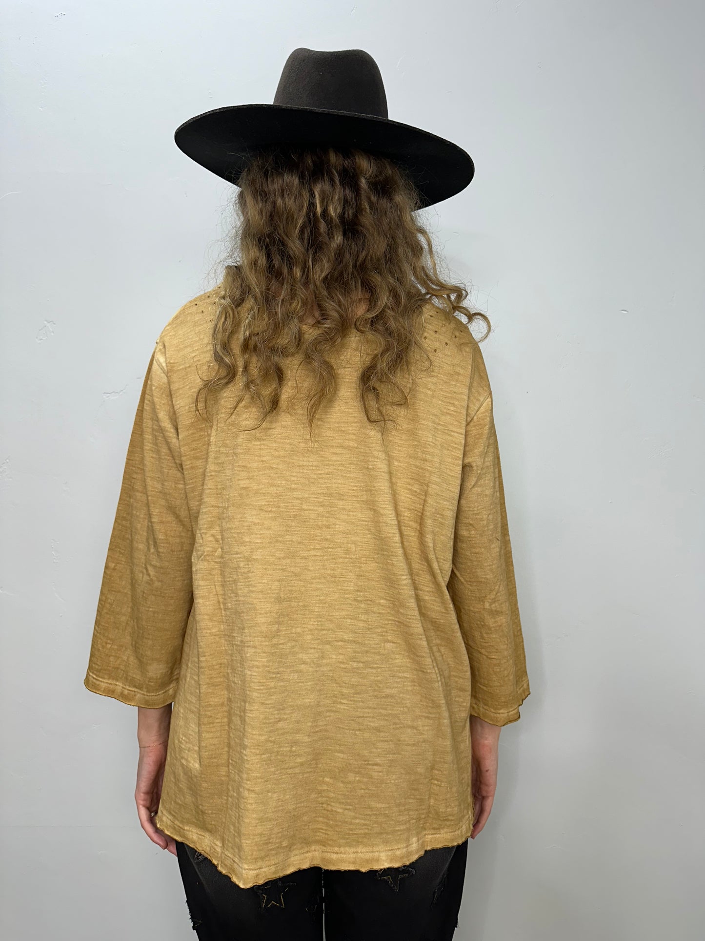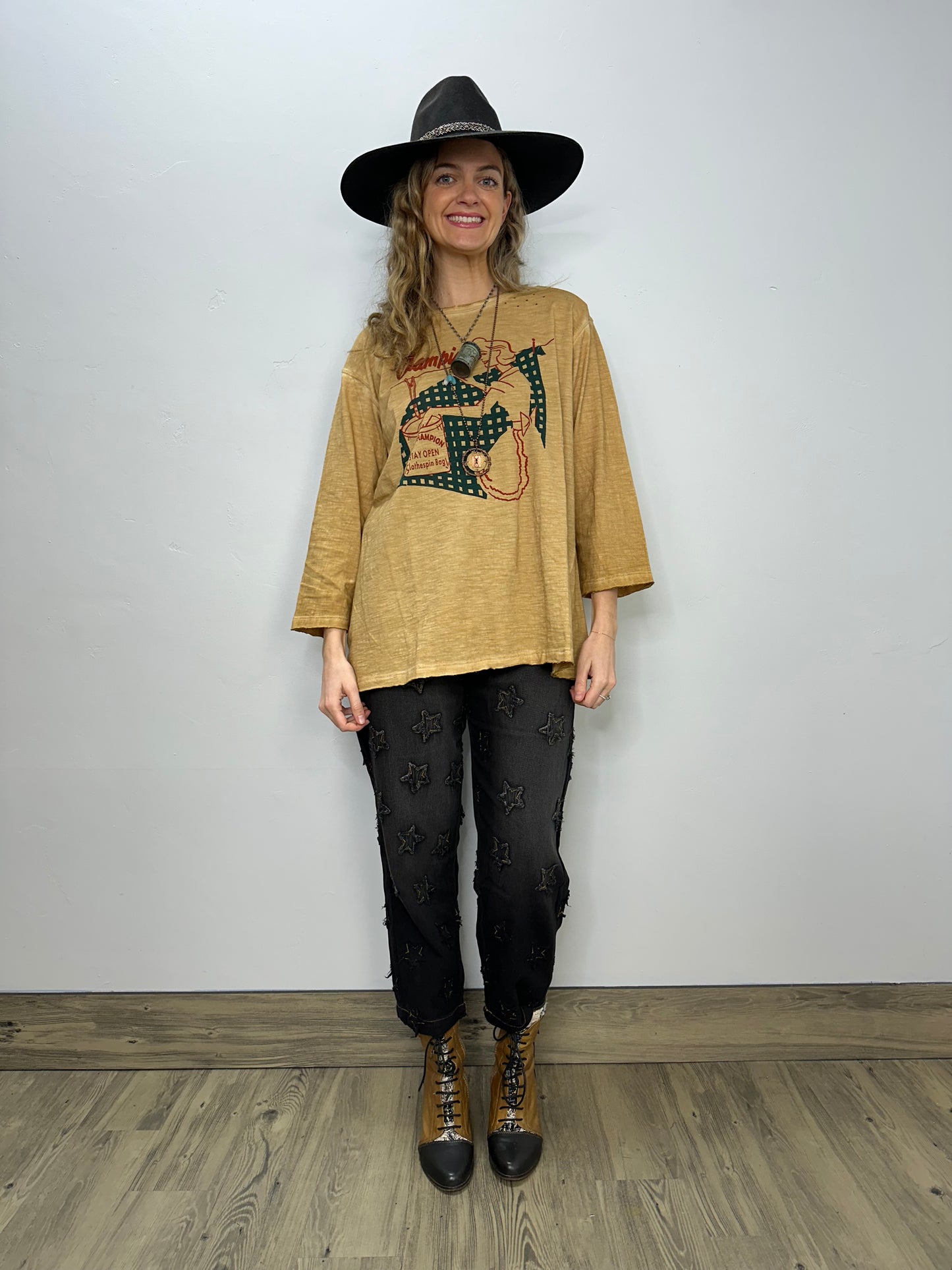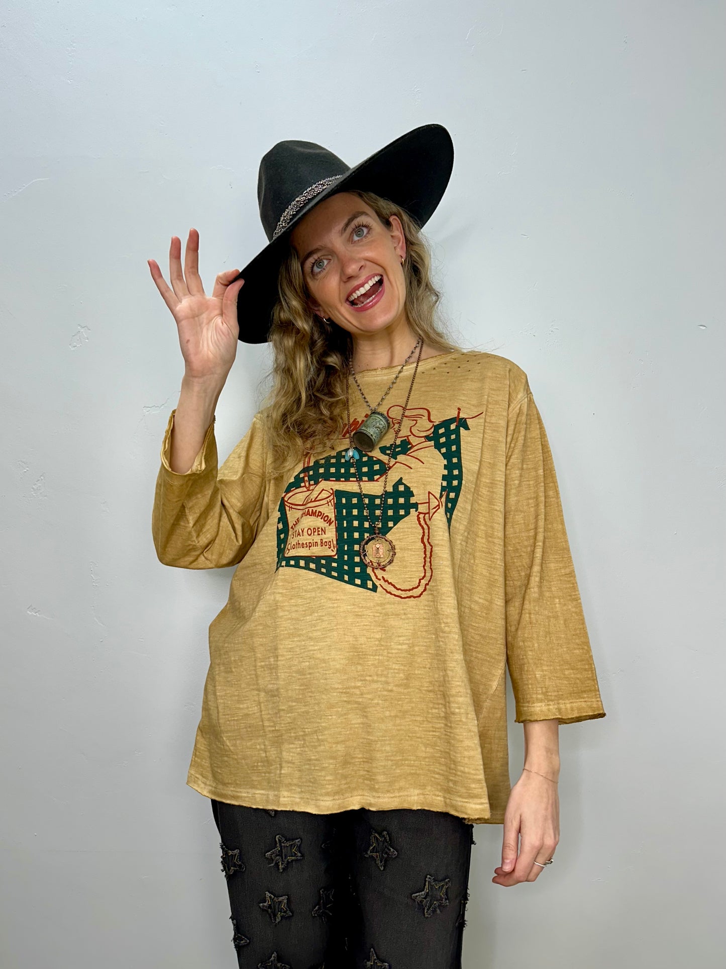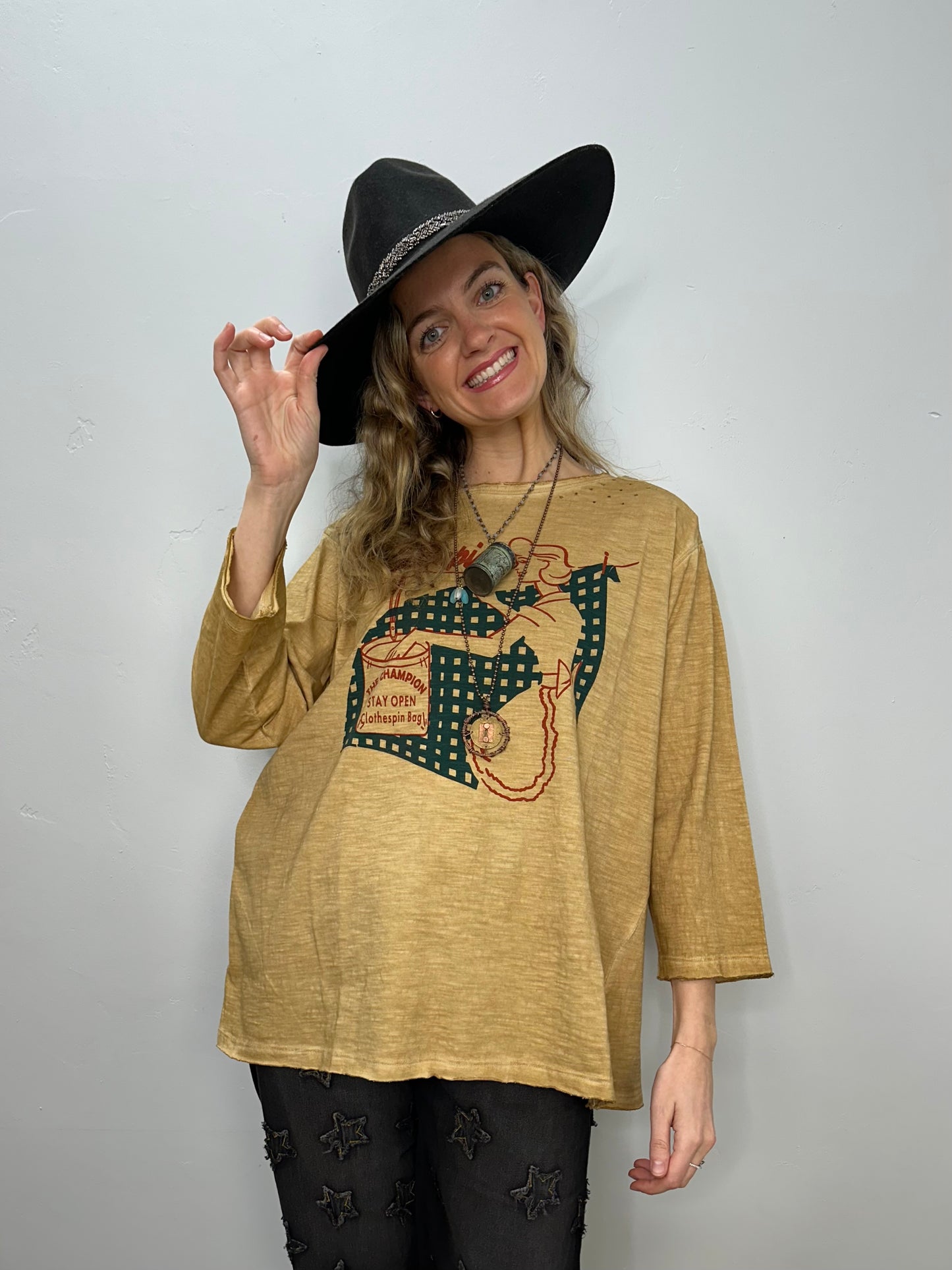 Get ready to rock that vintage look with our Retro Printed Distressed Tea-dye Tee! This one-size-fits-all top boasts a unique retro print and a trendy distressed look that will surely make a statement. Comfortable and stylish, this tee is perfect for any casual occasion. Grab yours now and turn heads wherever you go!
