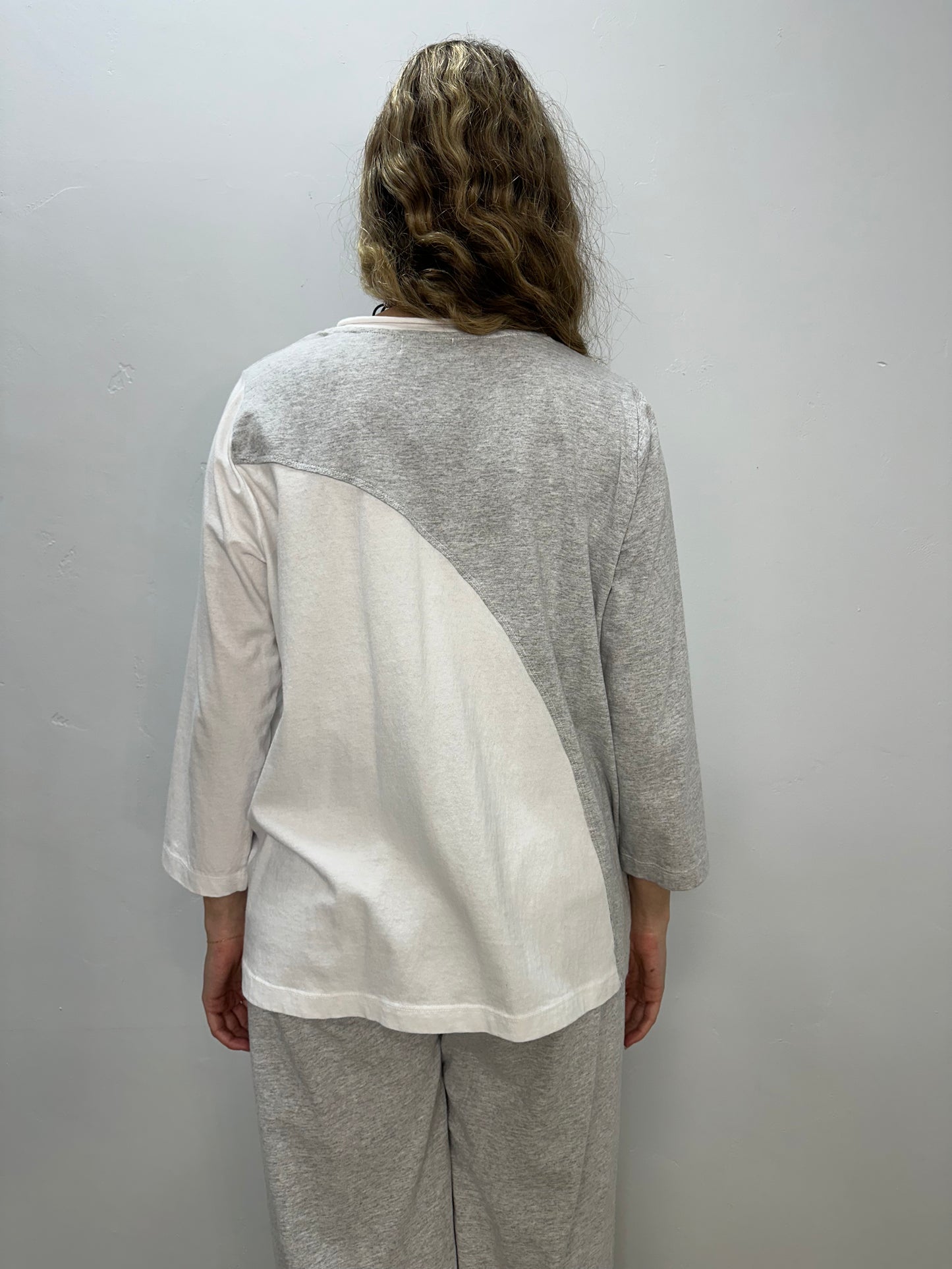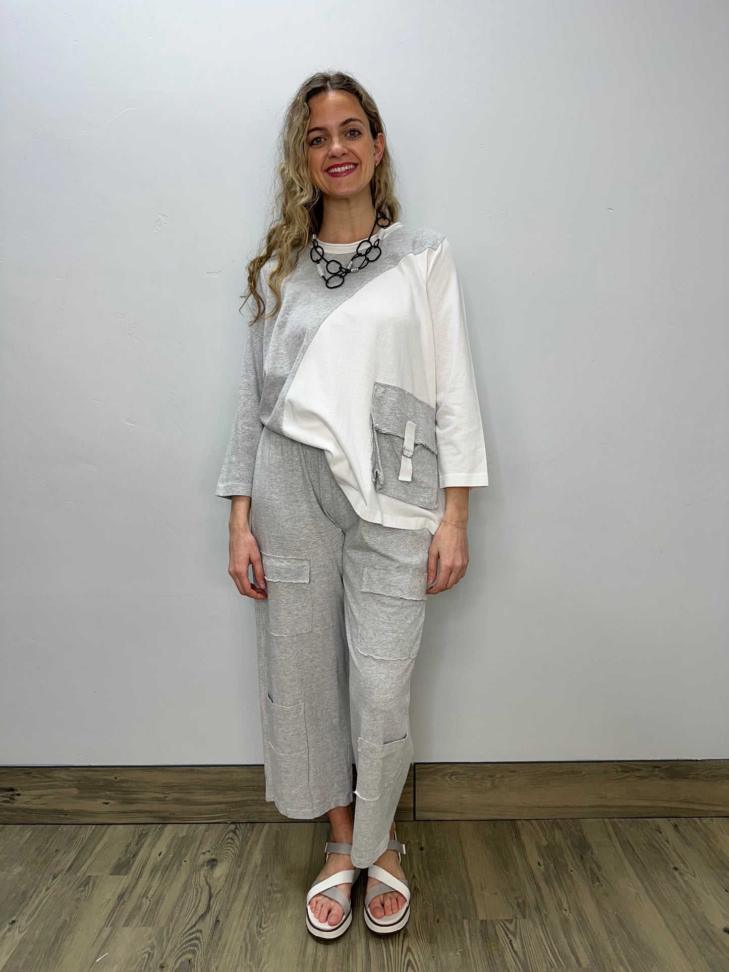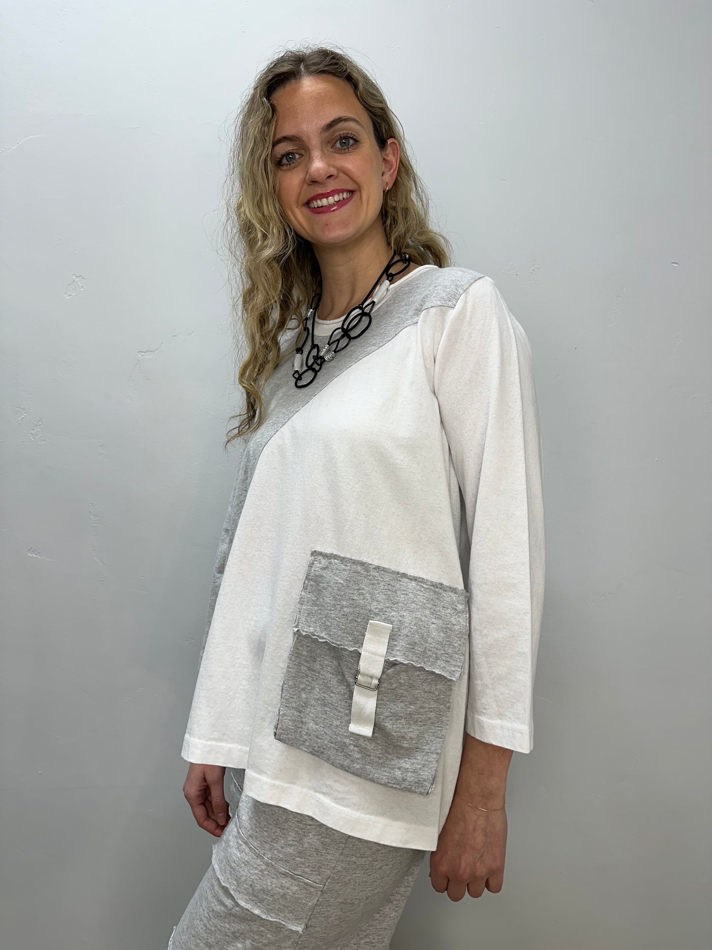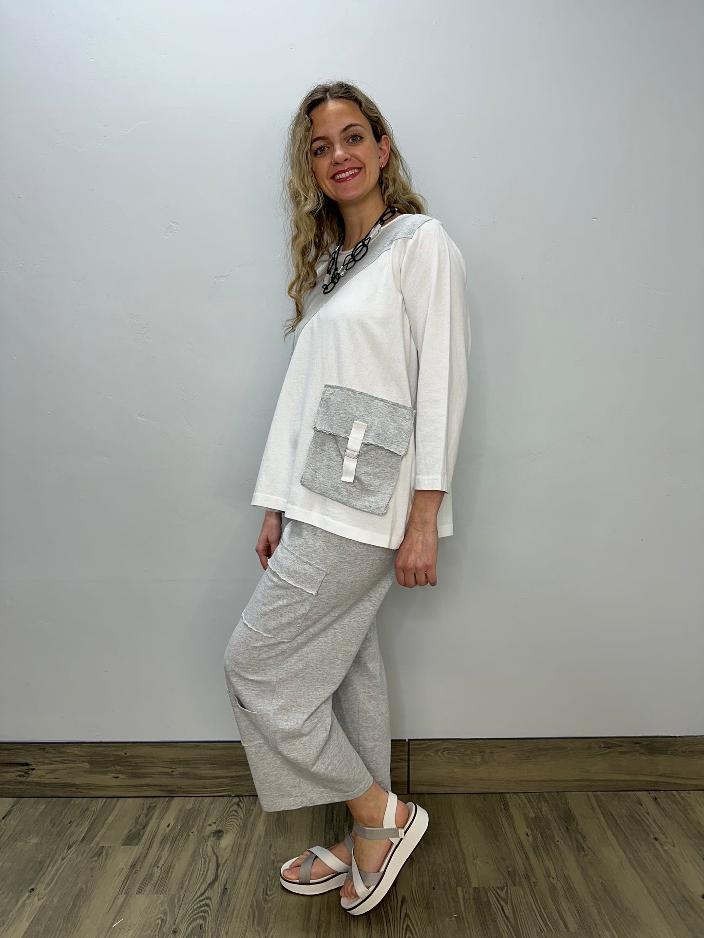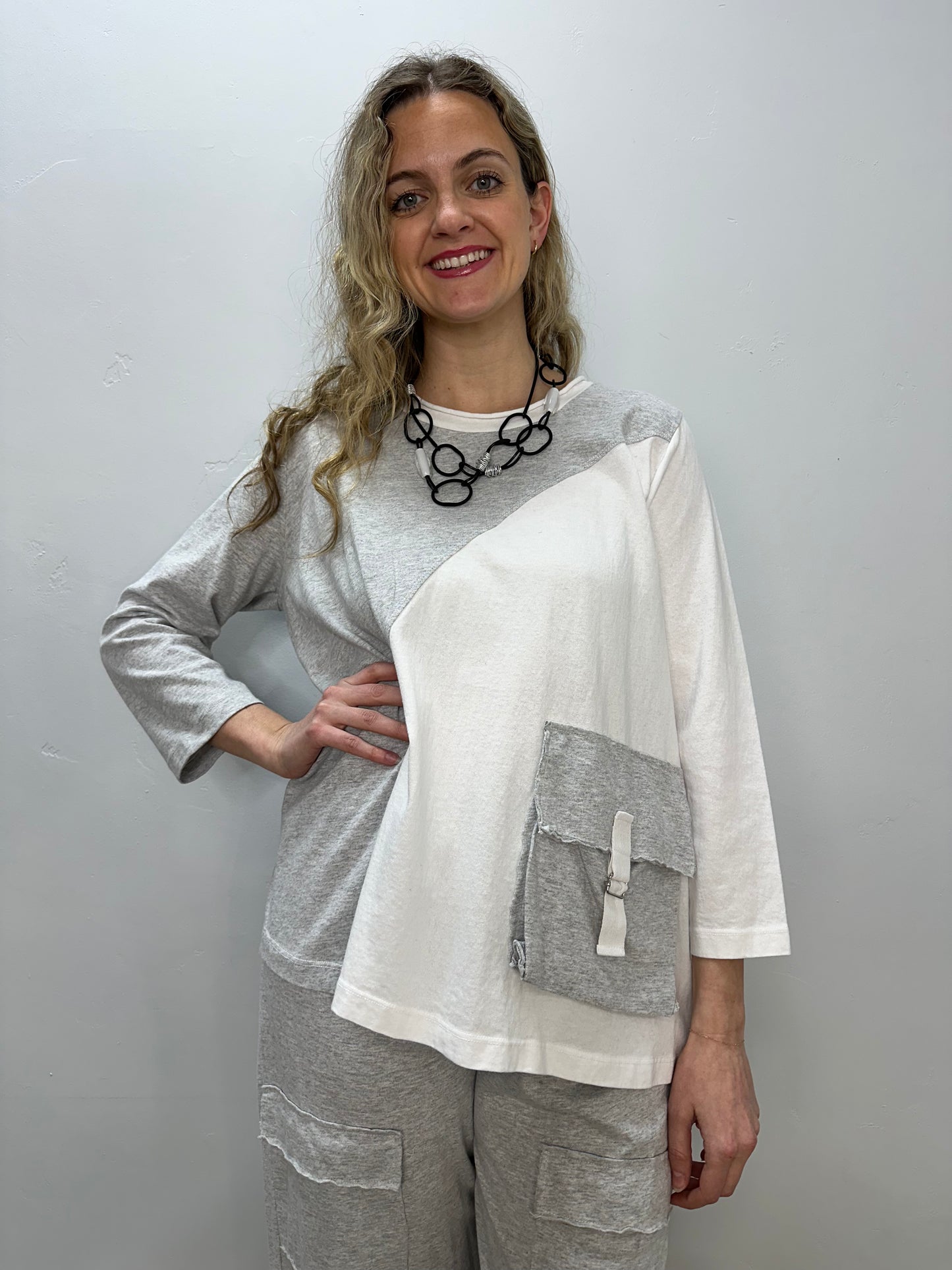 This White and Heather Gray Cotton 3D Pocket Top is fashionable with a scoop neck and abstract design. The functional left side pocket adds convenience and the 3/4 length sleeve provides comfort and coverage. Elevate your wardrobe and stay trendy with this top!