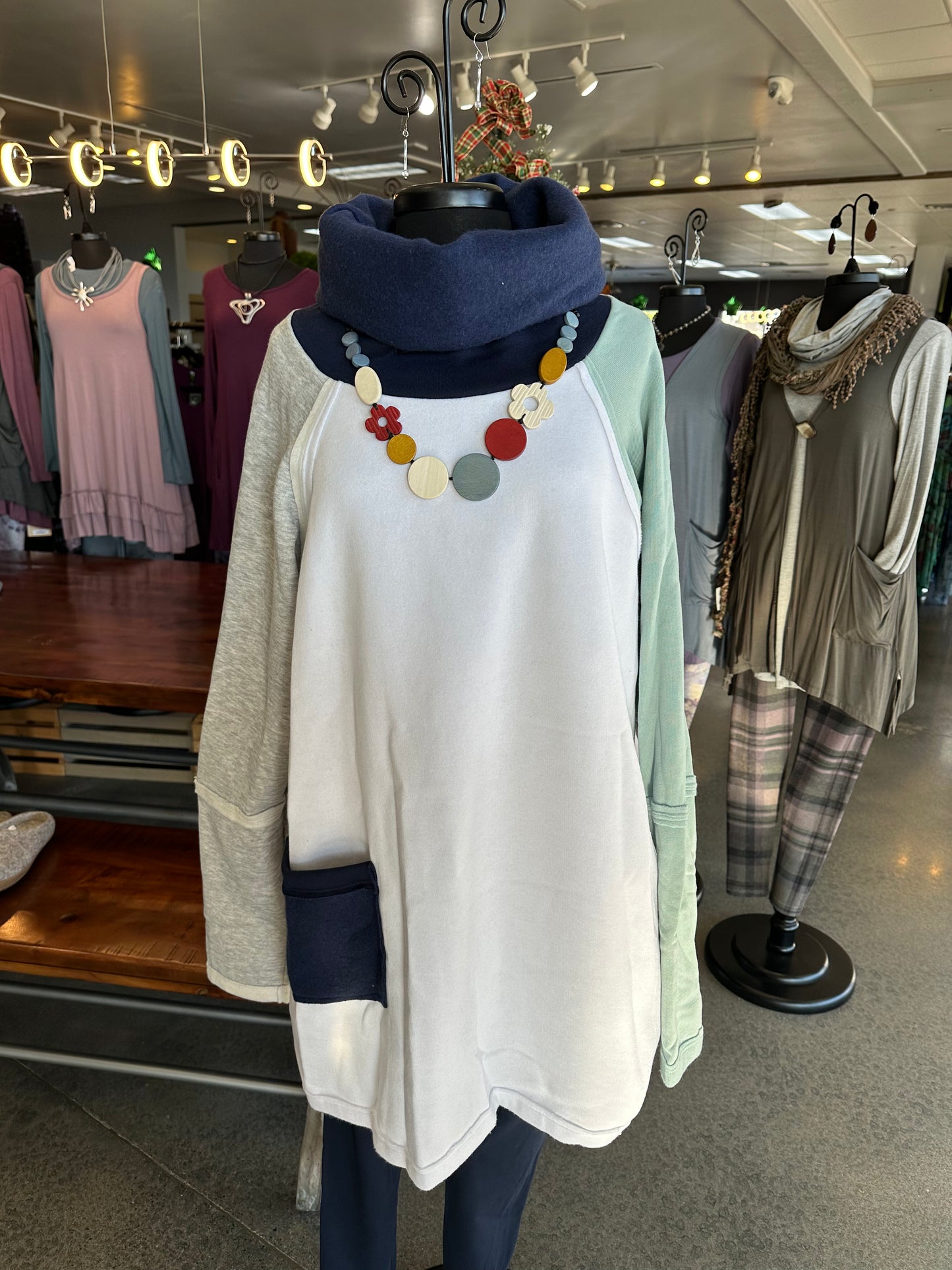 Designed by Twist Boutique owner Trish, the new Colorado flaunts a generous funnel neck that easily adjusts to your desired style to stay warm and cozy this season! Contrast raw seams and a right side patch pocket create added interest. Five inch sleeve cuffs allow you to roll them up to the look and length you prefer. Inside you'll find ultra soft fleece that keeps you comfy and cozy.