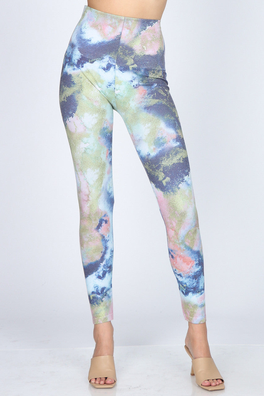 The M. Rena cropped high waist leggings feature their iconic tummy control waistband and a watercolor and gold foil sublimation print.