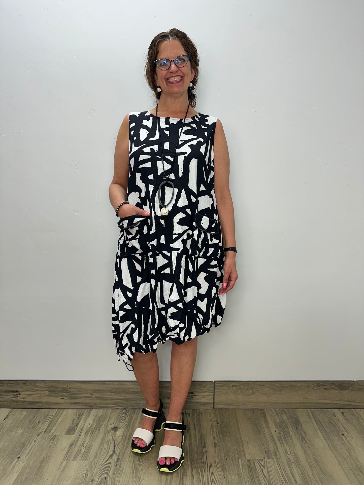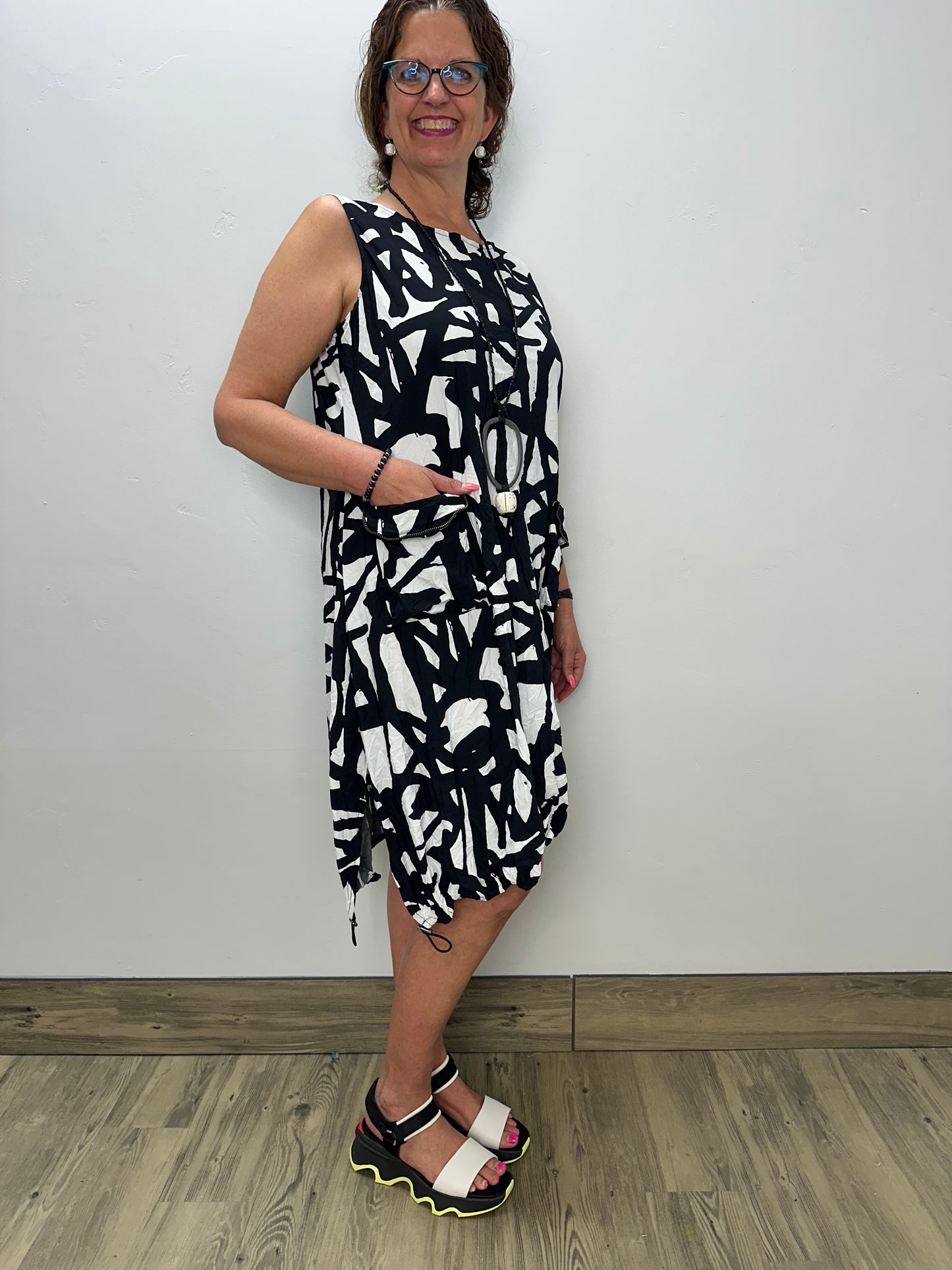 Say hello to easy elegance with the Chalet Doodles Dress. A sleeveless beauty that features a rounded neckline with a unique asymmetrical hem with a playful elastic cording detail. Front patch pockets with faux flaps and zipper teeth trim add edgy flair, all in an A-line silhouette that embodies the pure essence of a refreshing season.
