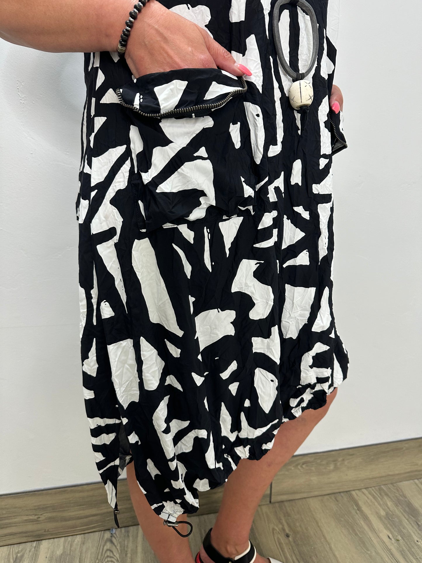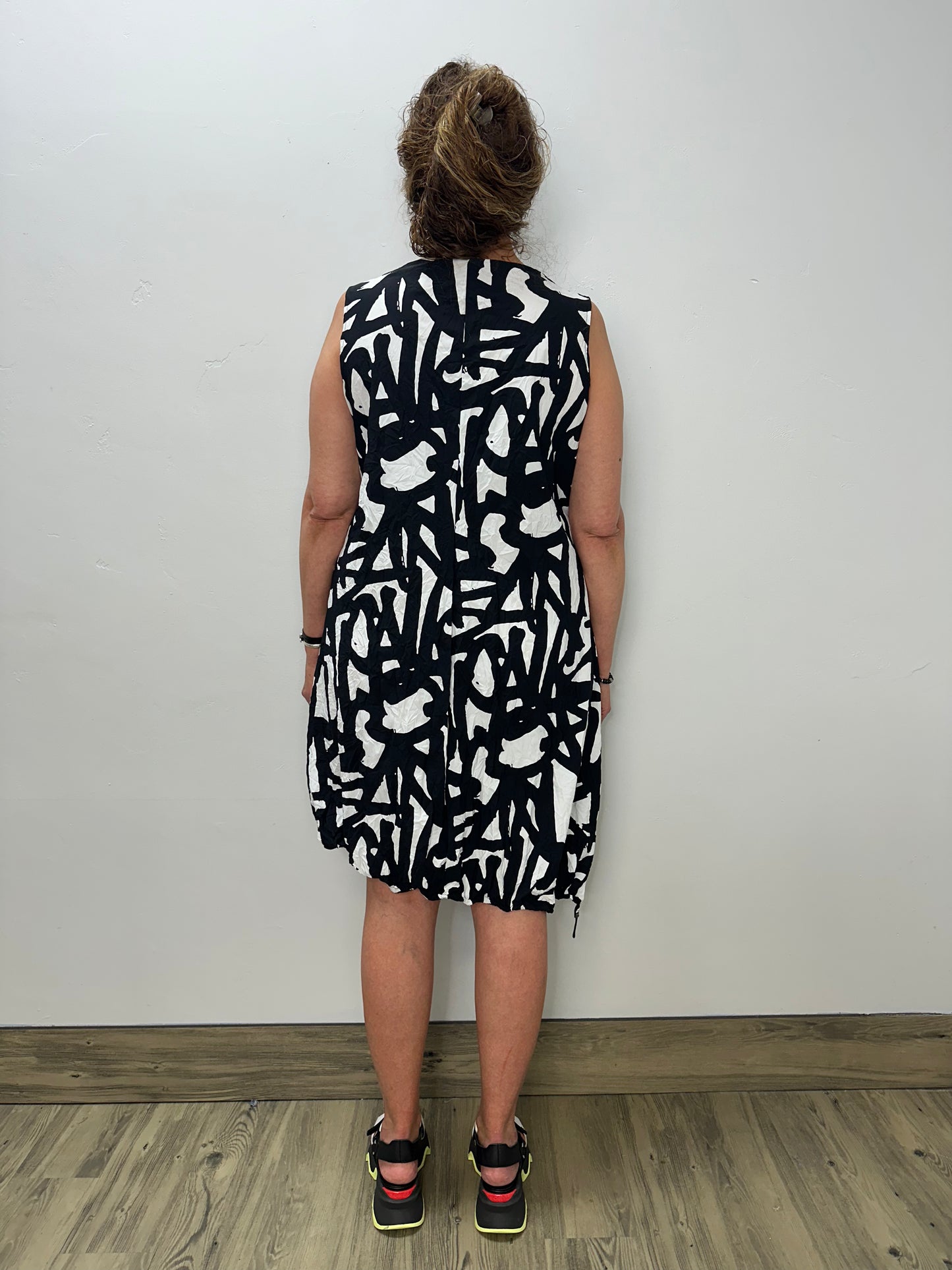 Black and White Doodle Sleeveless Asymmetrical Parachute Dress