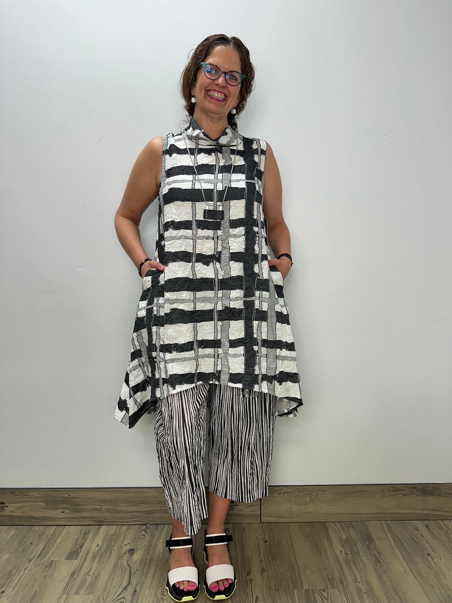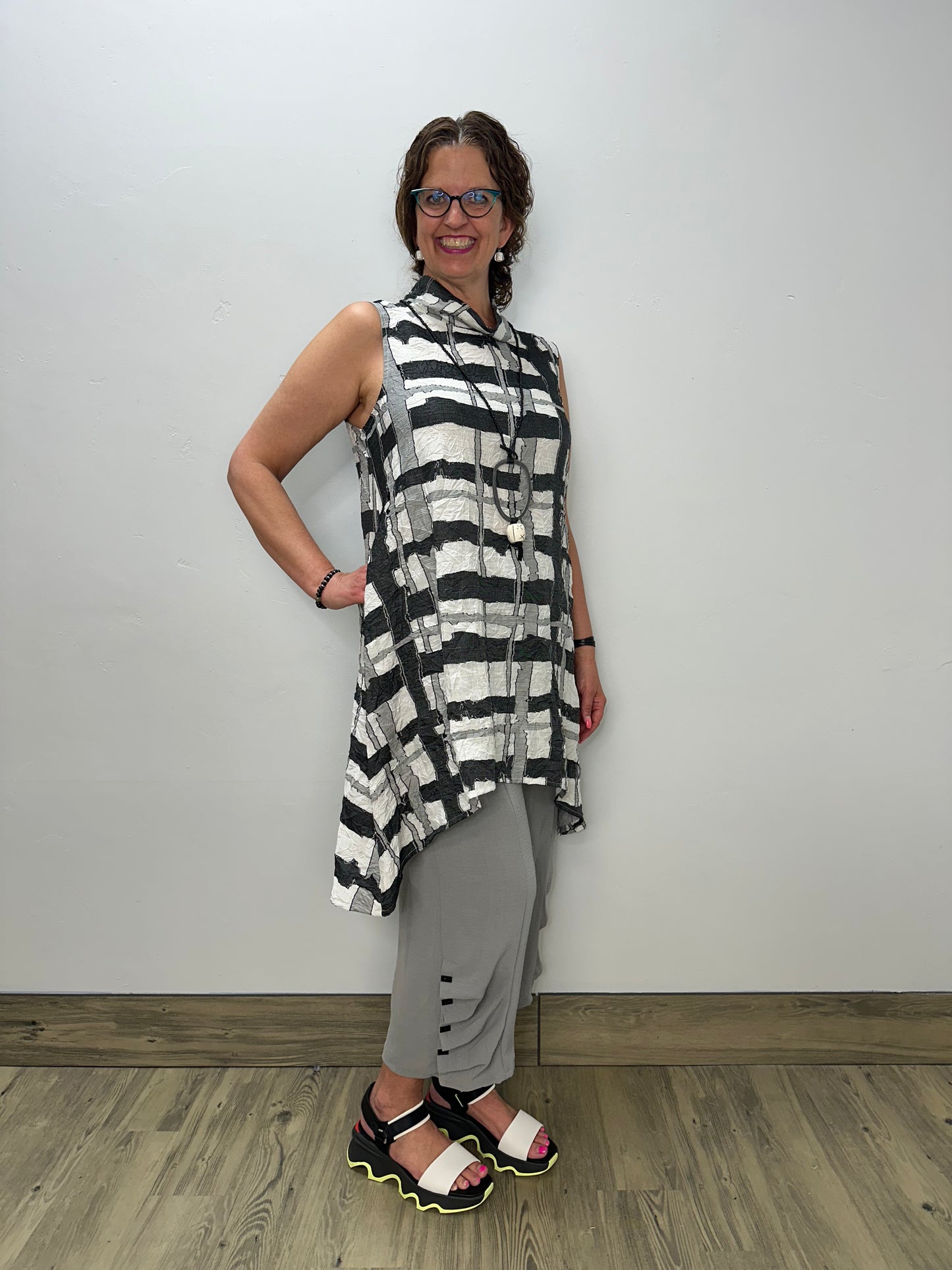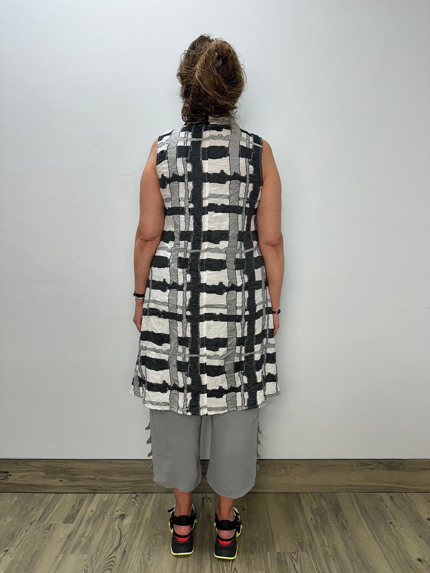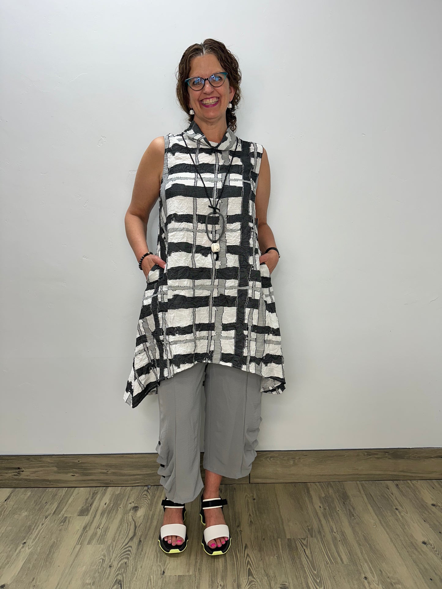 Elevate your wardrobe with our Black and White Hi-Low Sleeveless Tunic. The luxurious crinkle fabric adds dimension and texture while eliminating the need for ironing. This versatile piece drapes beautifully over your silhouette, creating an effortlessly chic look that transitions seamlessly from day to evening. Perfect for pairing with leggings or skinny jeans for a complete, fashion-forward ensemble.