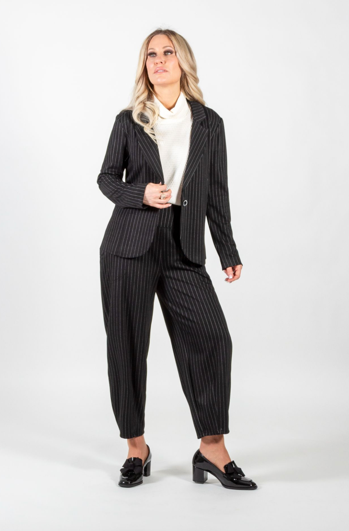 Elevate your professional look with our Black Grey Pinstripe Blazer. Featuring a flattering one button closure and a collared neckline, this blazer exudes sophistication. Pair it with the matching pant for a sleek and polished outfit.