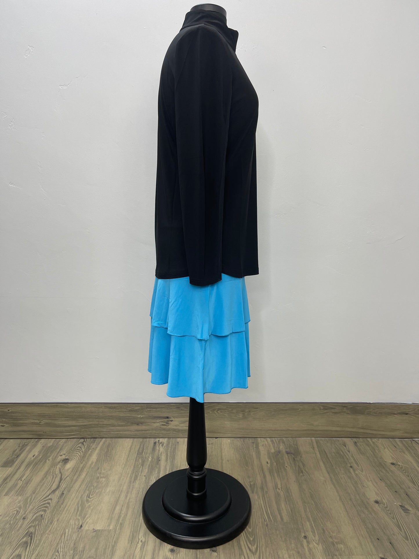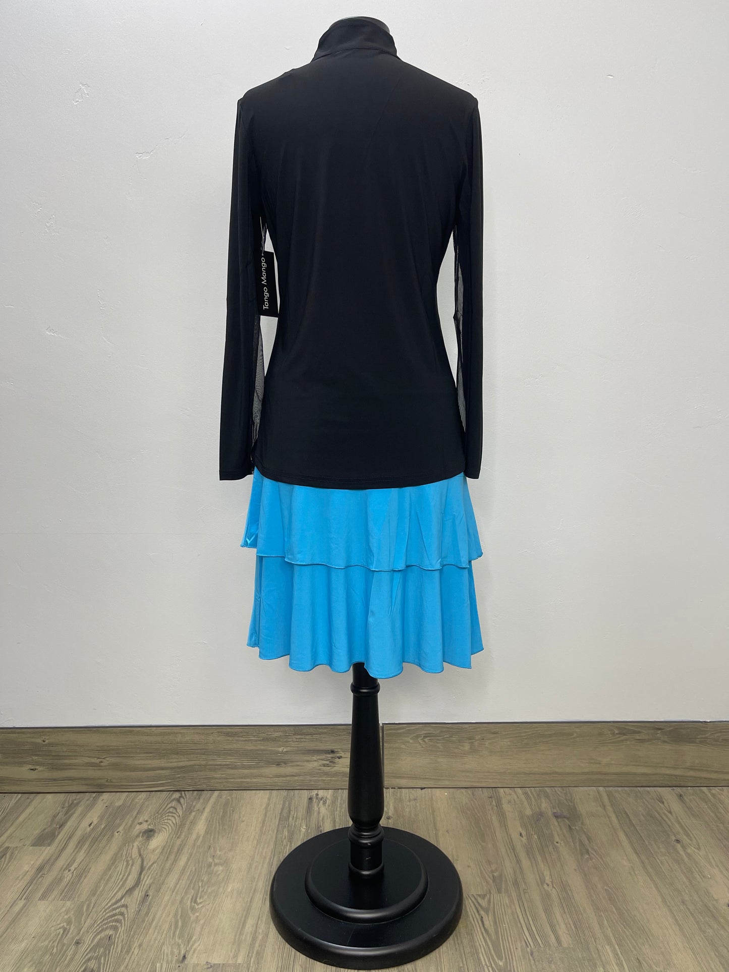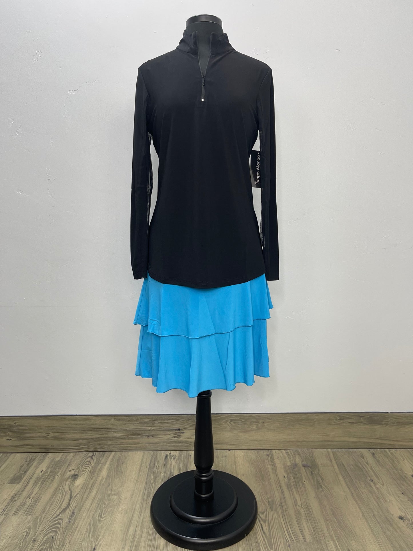 This long sleeve Tango Mango top is designed with a zippered collar and long sleeves that are made with a mesh fabric underneath. A generous amount of stretch throughout.