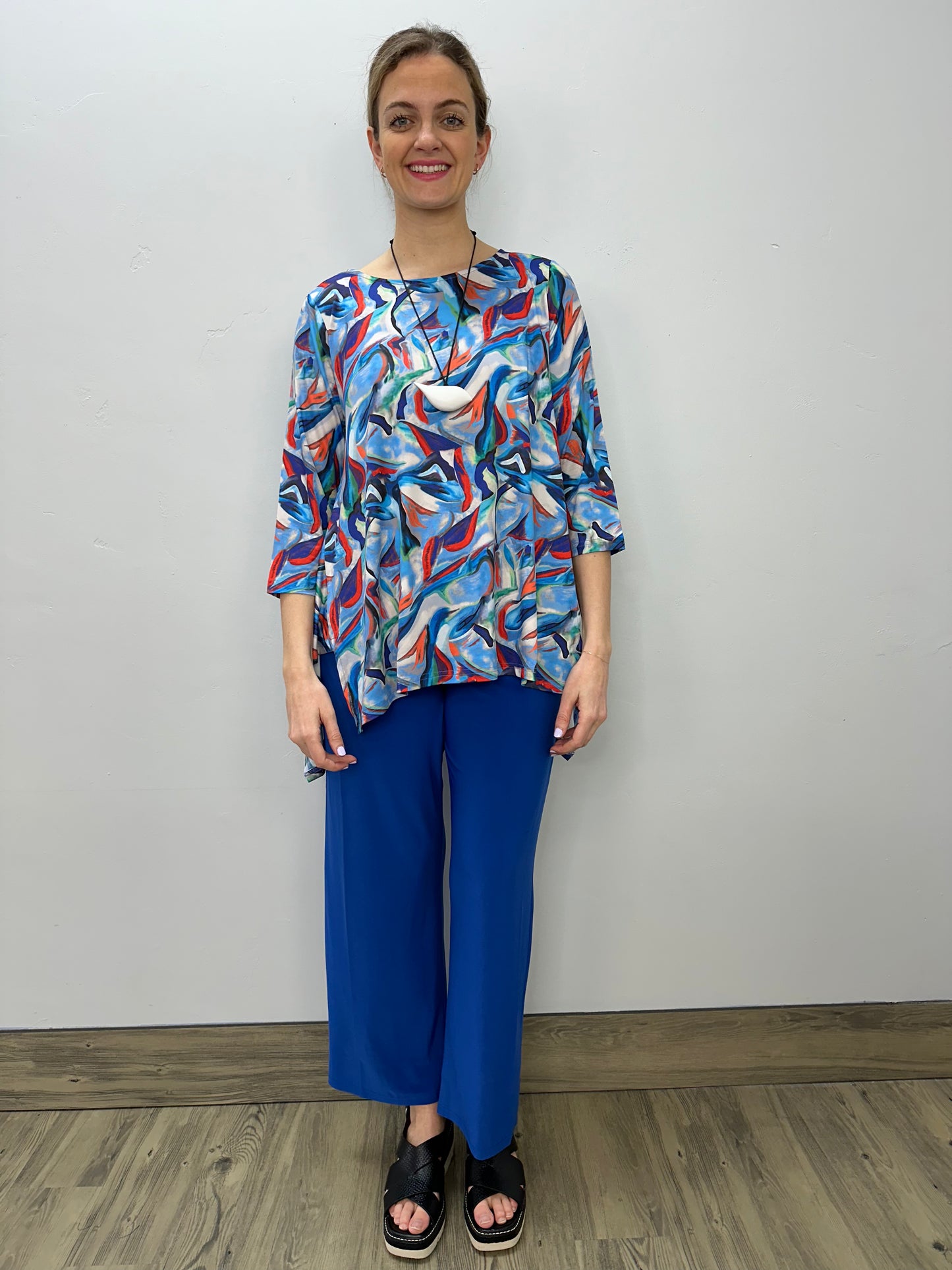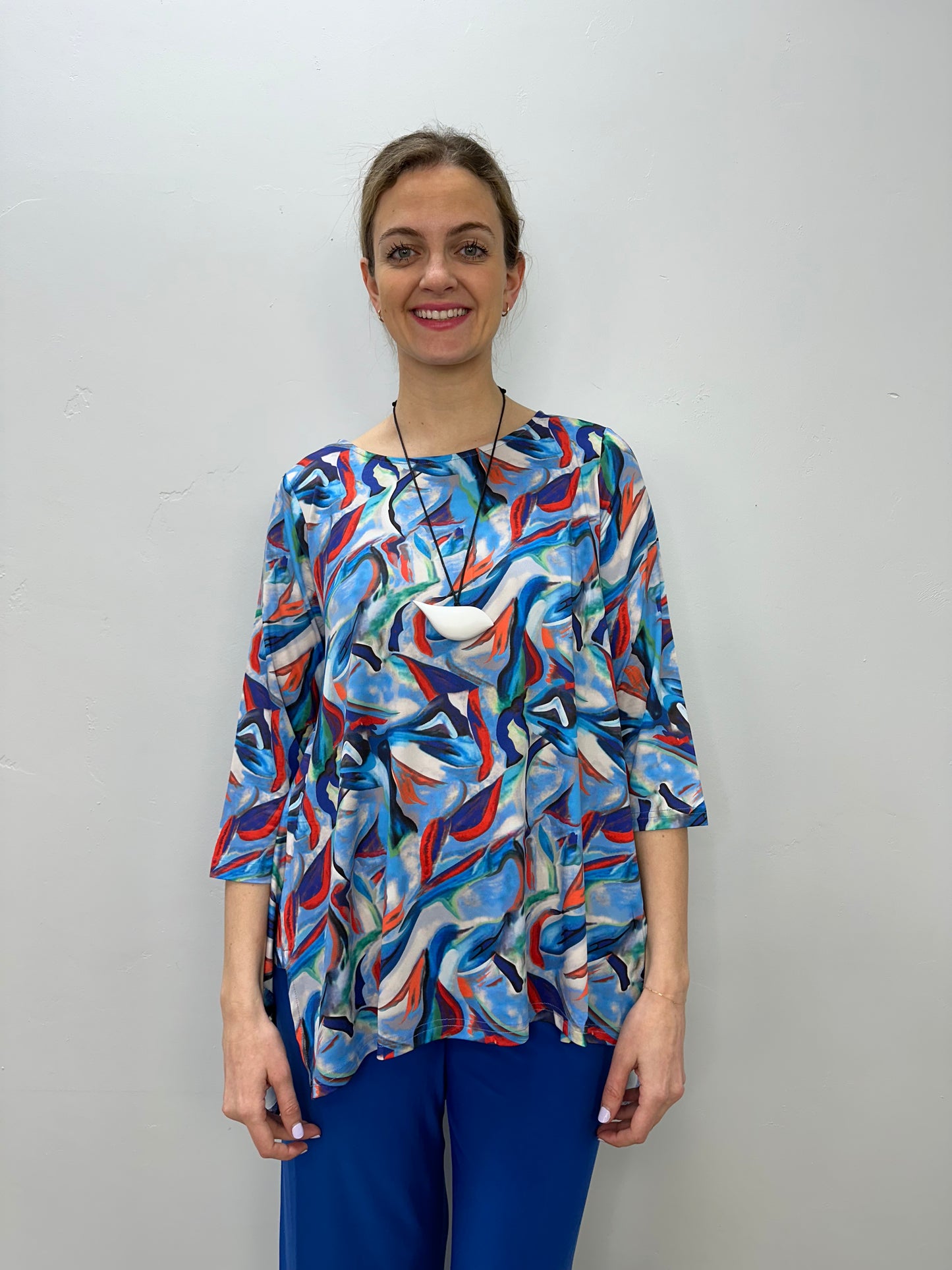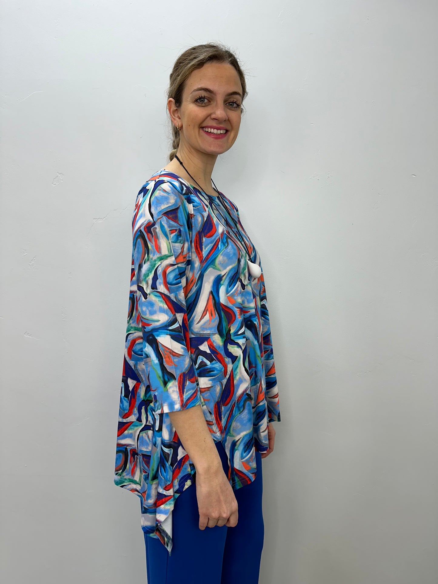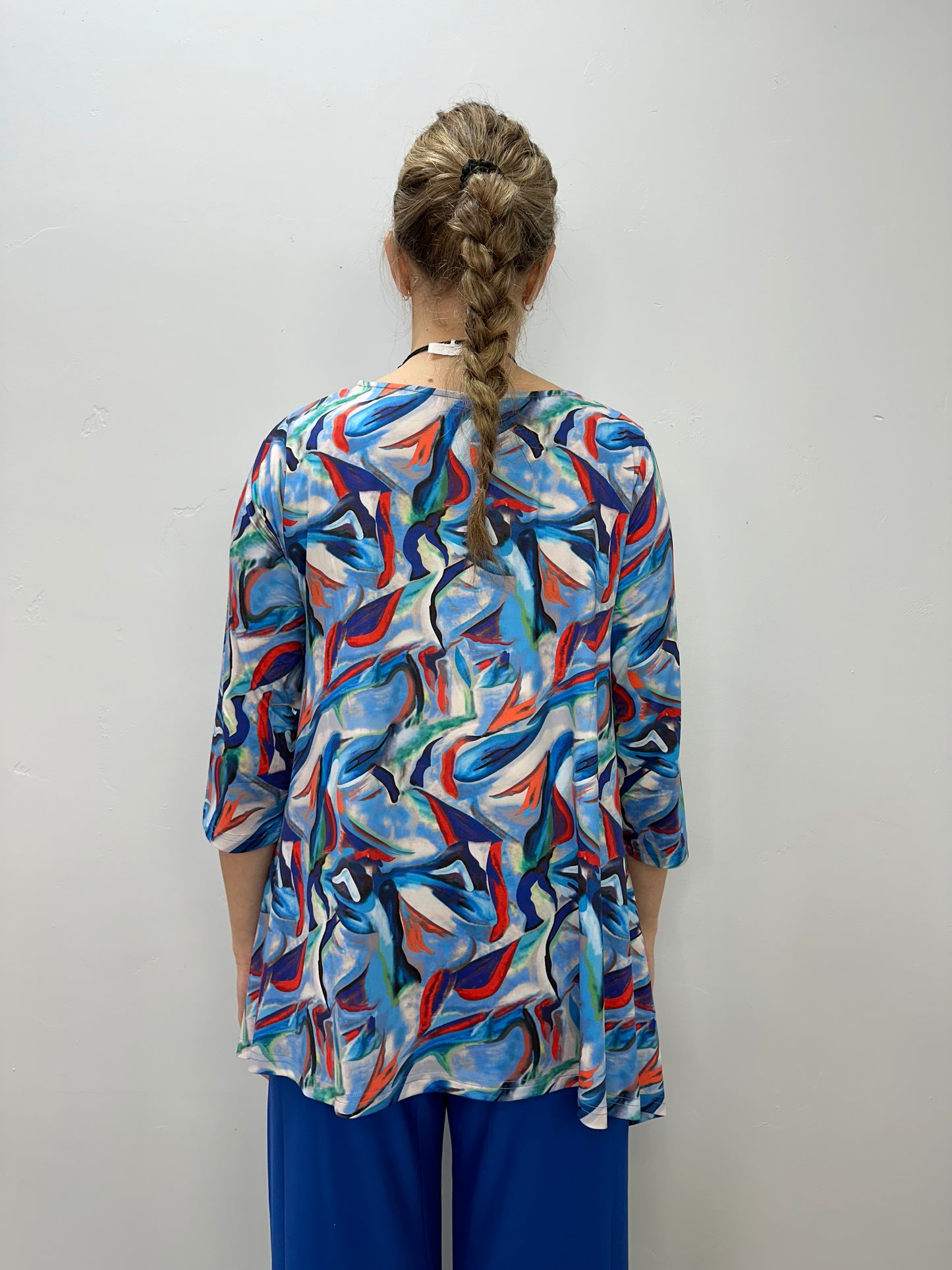 Blue and Red Abstract Pattern 3/4 Sleeve Shark-bite Tunic
