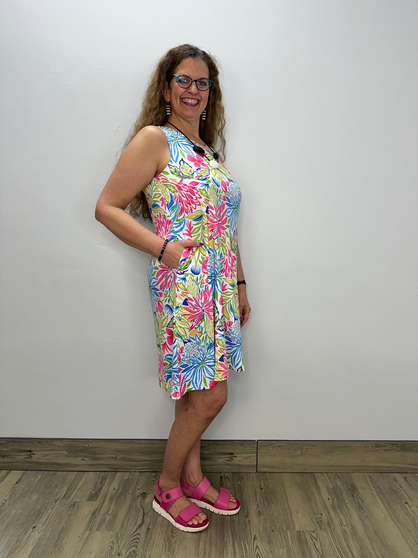 Bright Spring Floral Pattern Sleeveless Aline Dress with Keyhole