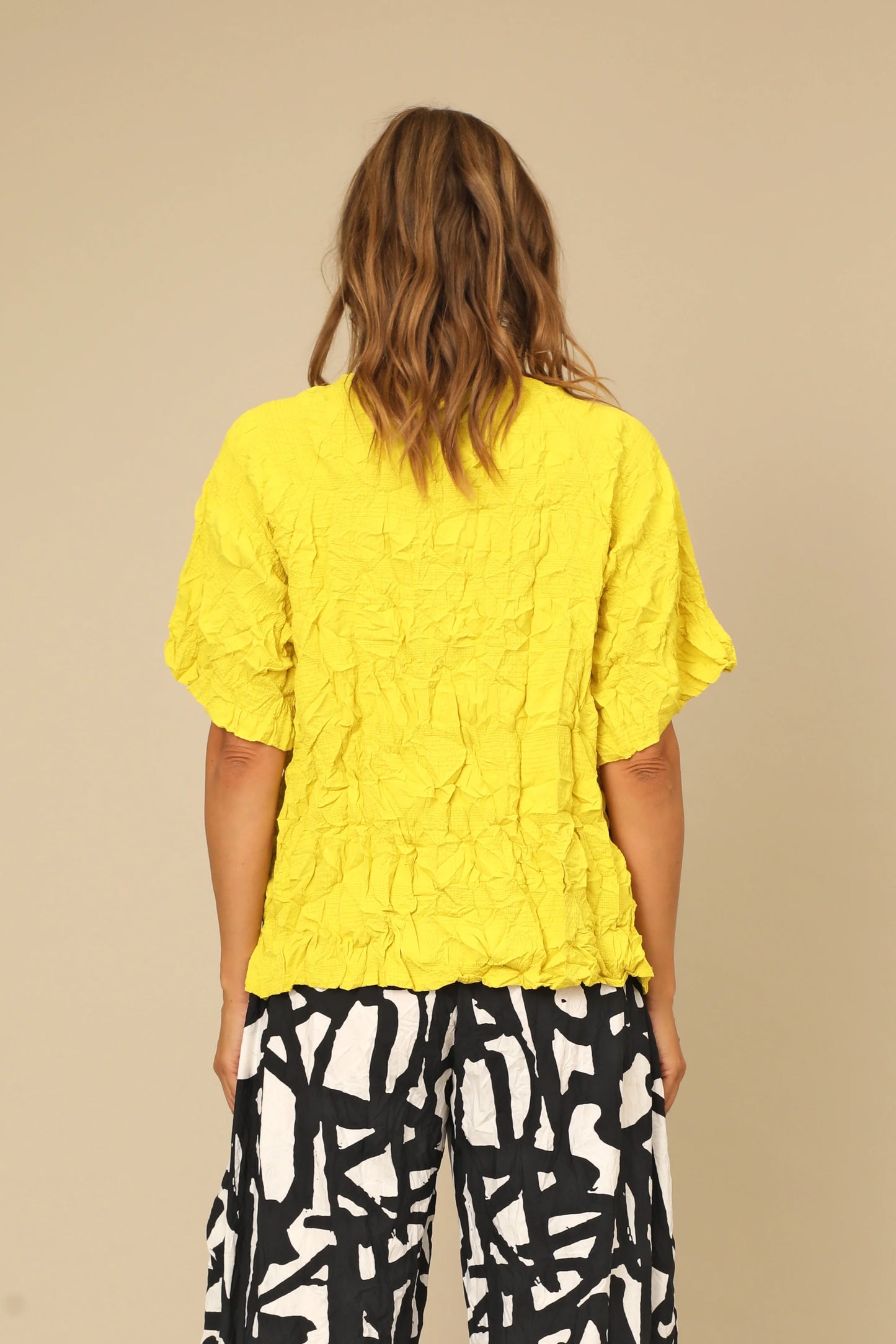 Our one and only Citrus Yellow European Crush Crinkle Top, where structured style meets a playful aesthetic. Crafted from our beloved crinkled embossed woven fabric, it offers a boxy silhouette with drop shoulder elbow sleeves and patch pockets. Alongside a square neckline adding a sharp modern edge to a chic staple.