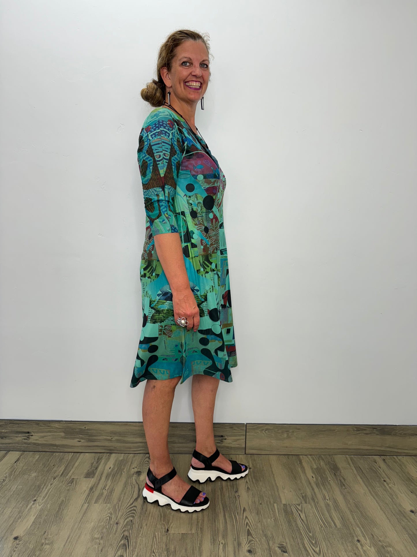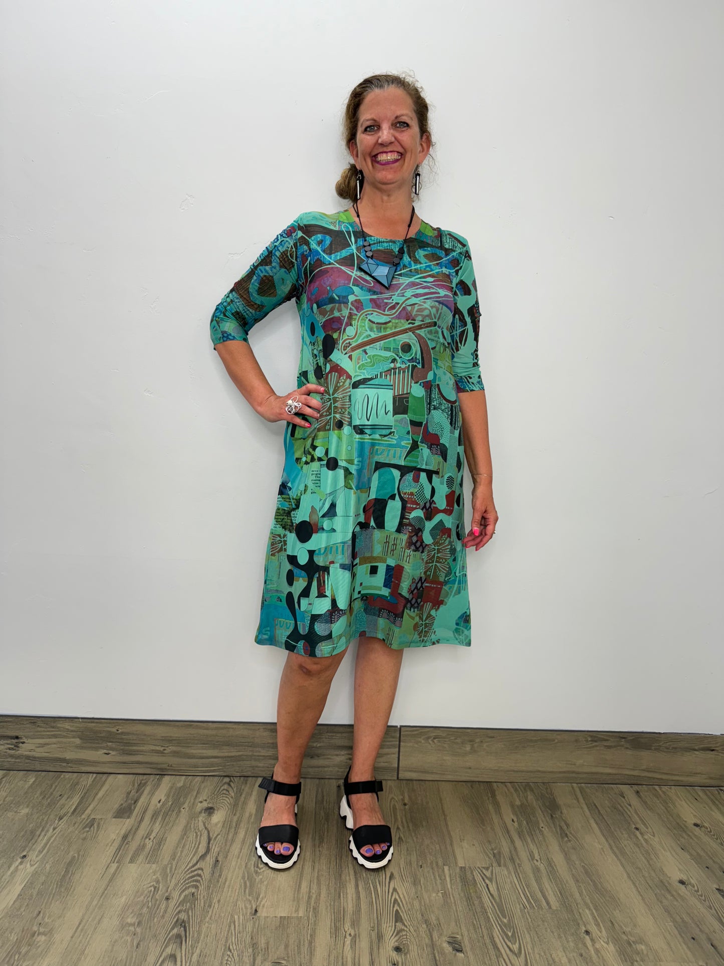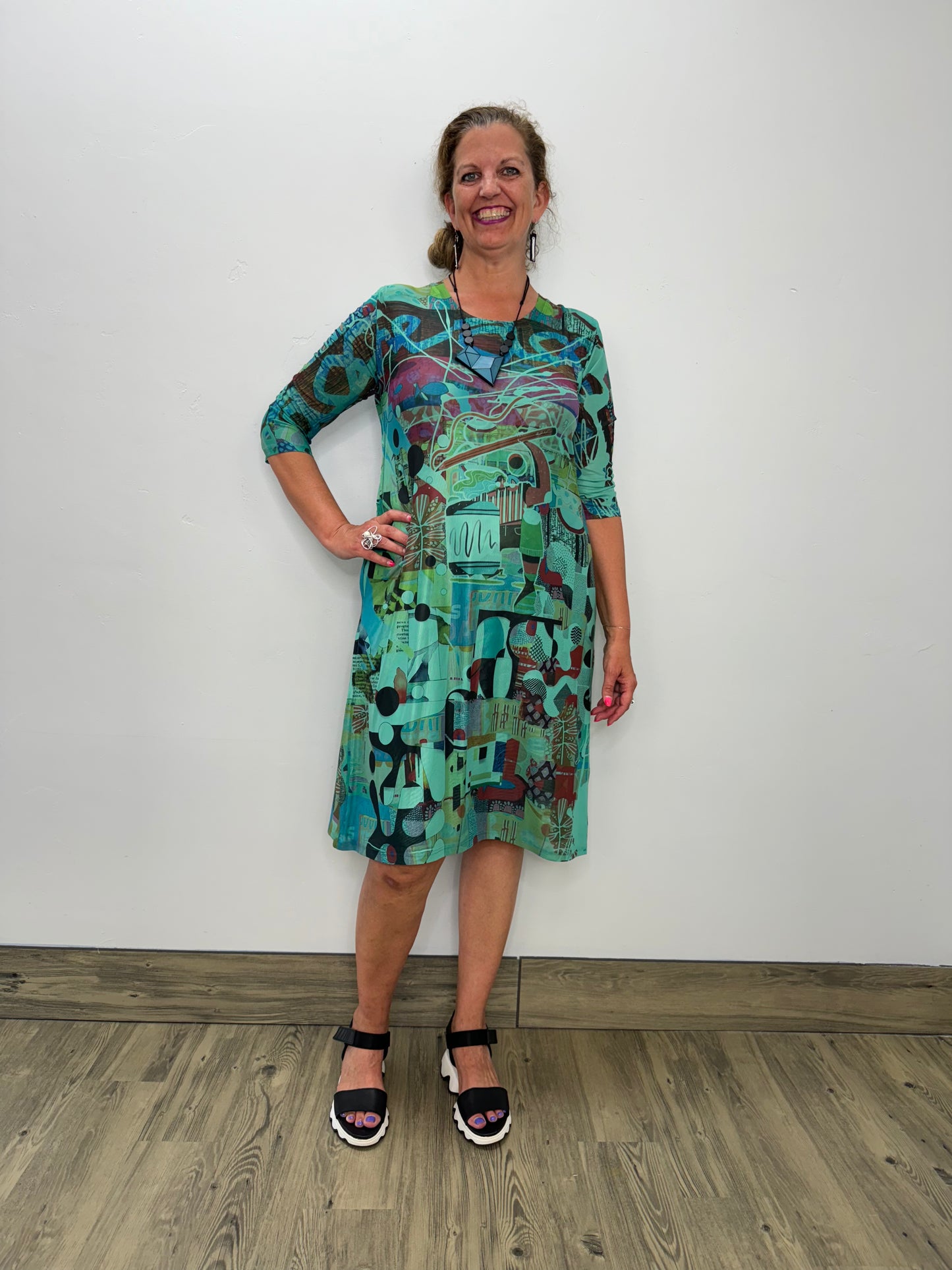 Indulge in ultimate comfort and style with our Emerald Mesh Dress. The lightweight mesh fabric and 3/4 sleeves make it perfect for any season. The dress also features side pockets for added convenience and comes in a stunning "Pencil Art" print. Make a statement with this must-have dress!