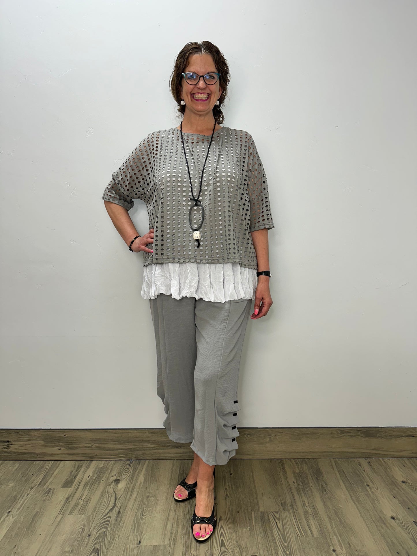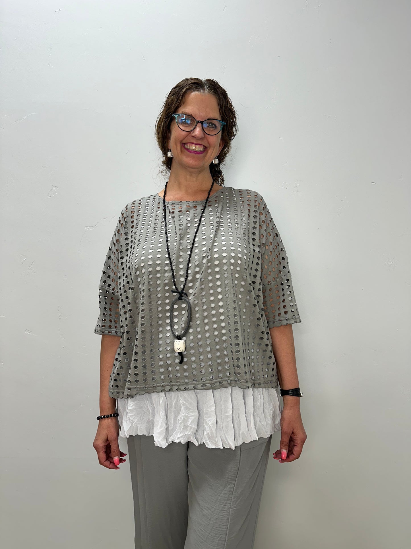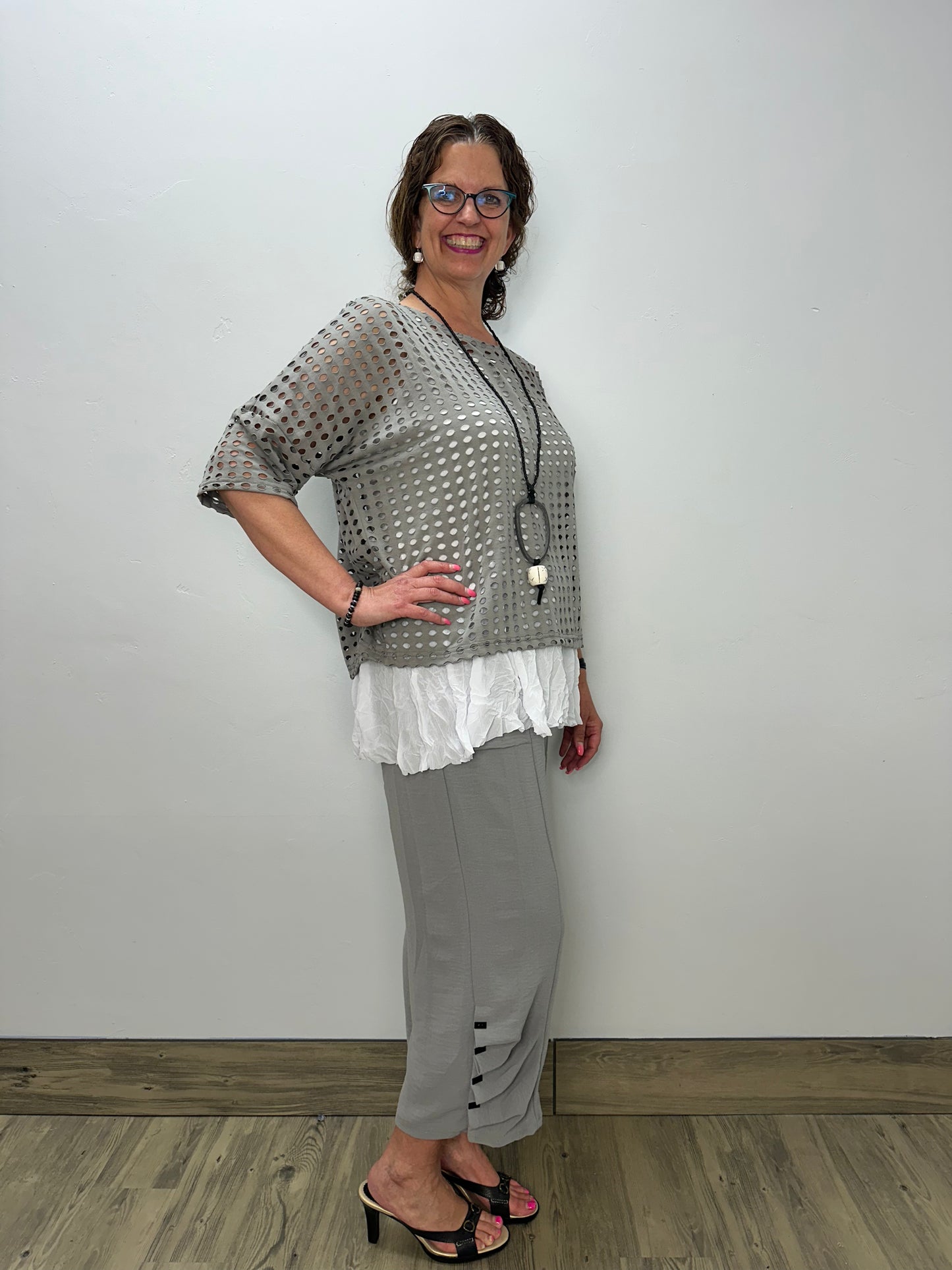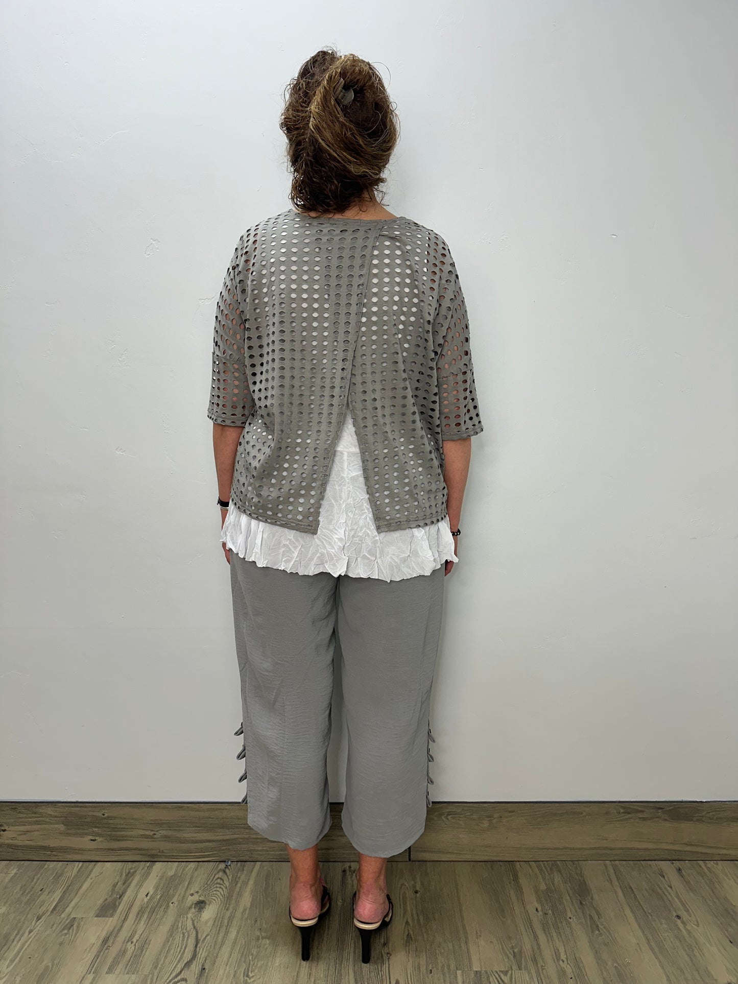 Make a statement in our Gray Holes Elbow Sleeve Top featuring a flattering scoop neck that elegantly frames your body. The playful perforated design adds unexpected visual interest, while the sophisticated slit back detail offers a subtle glimpse of skin. This figure-enhancing silhouette skims your curves in all the right places, creating a polished yet effortlessly cool look that's perfect for any occasion.