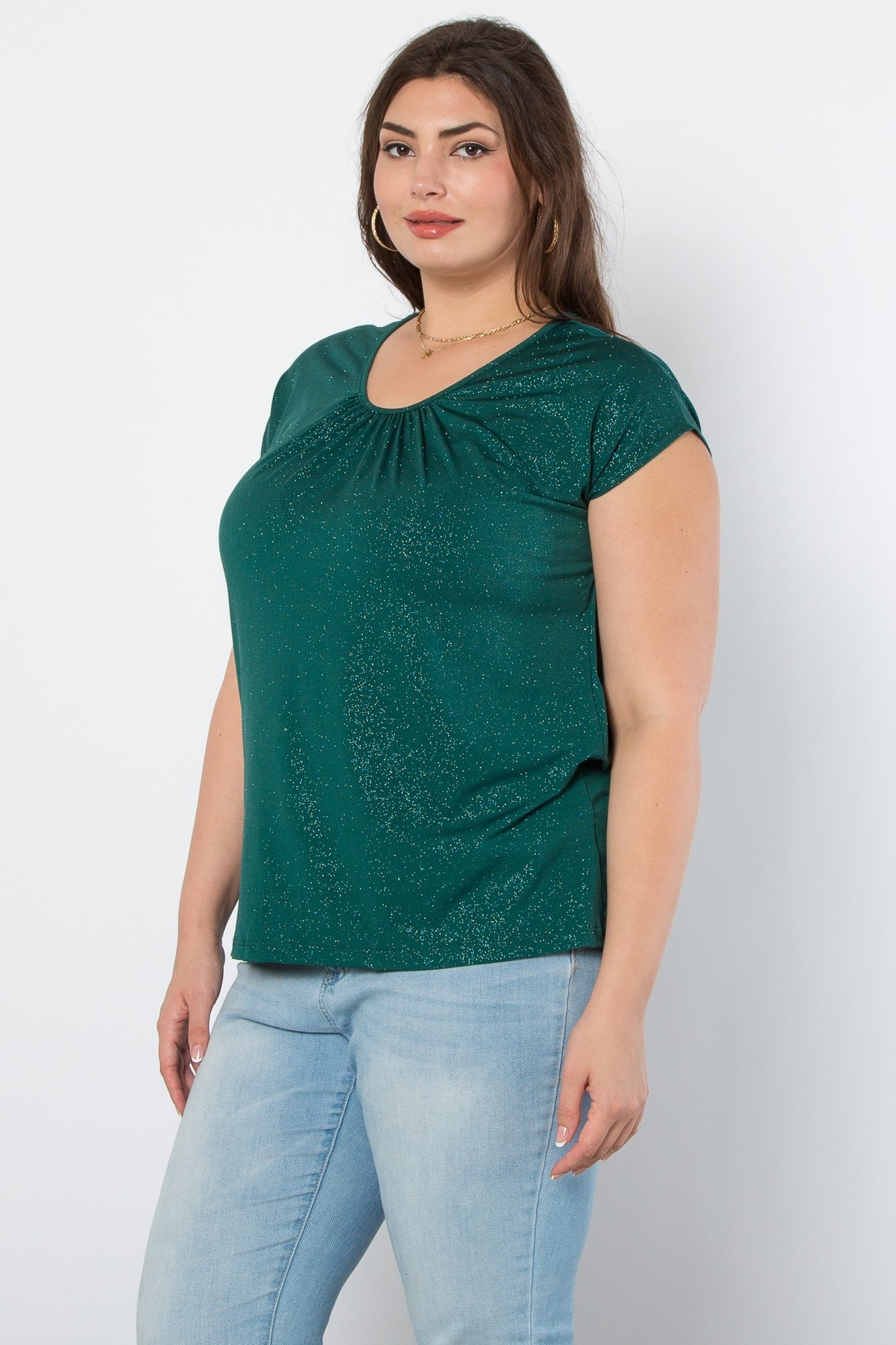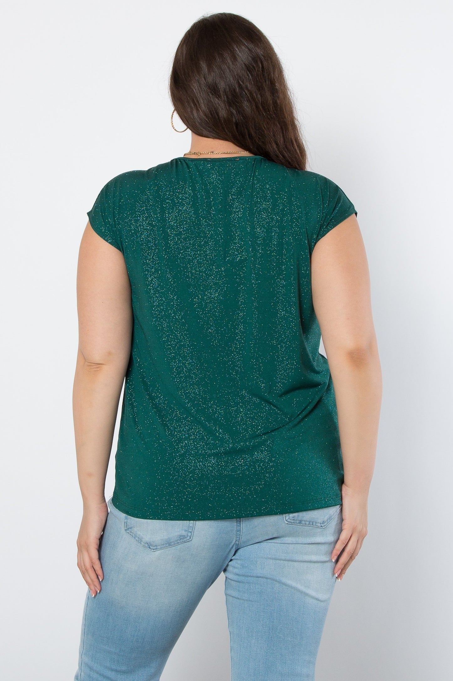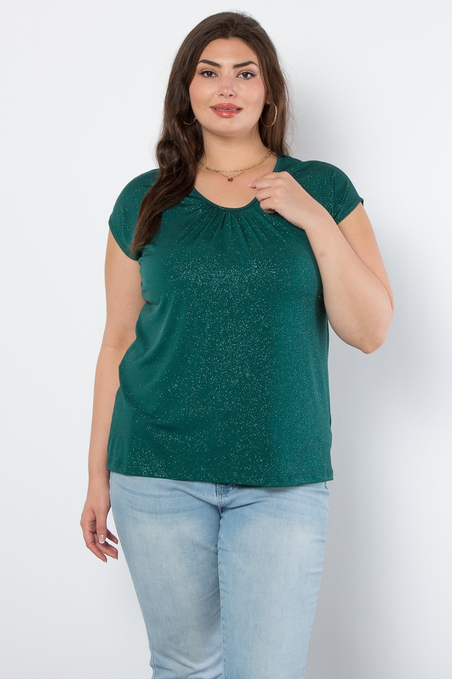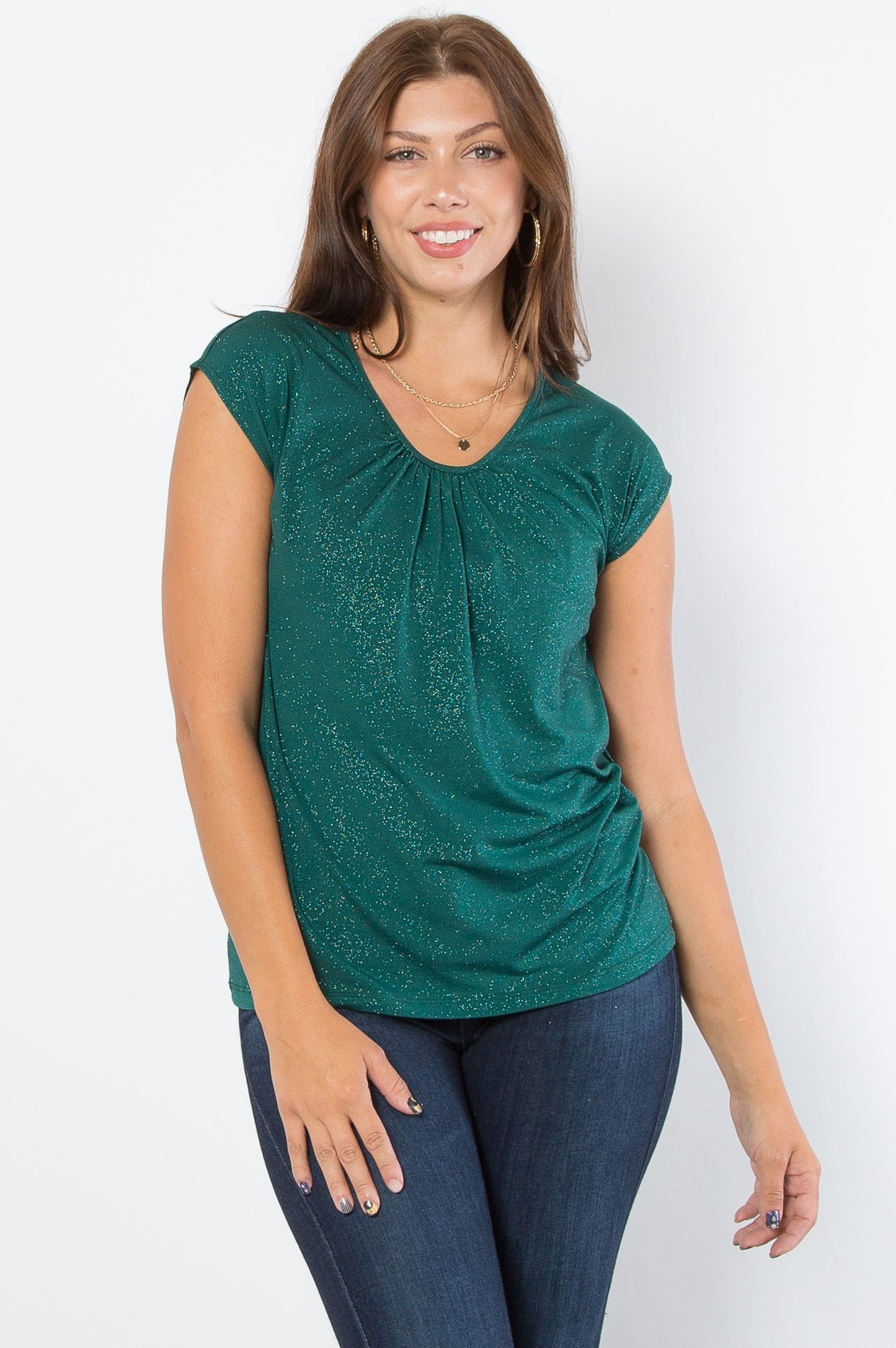 Regular price $29.40This stunning hunter green glitter short sleeve top will make you stand out at any holiday or event! With its soft v-neck and flattering cap sleeves, it is perfect for any occasion. Add a touch of sparkle to your wardrobe and make a statement with this beautiful top.