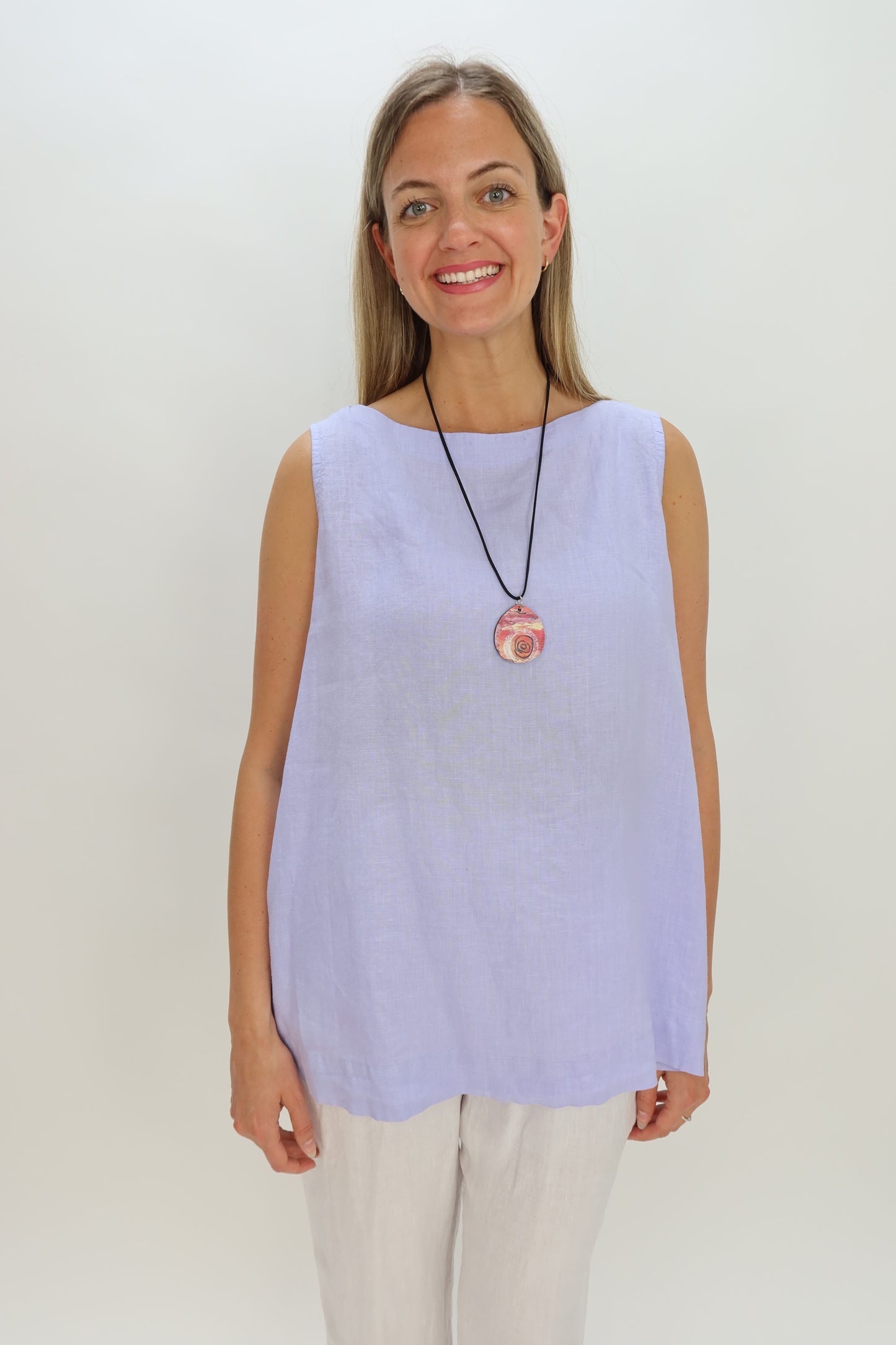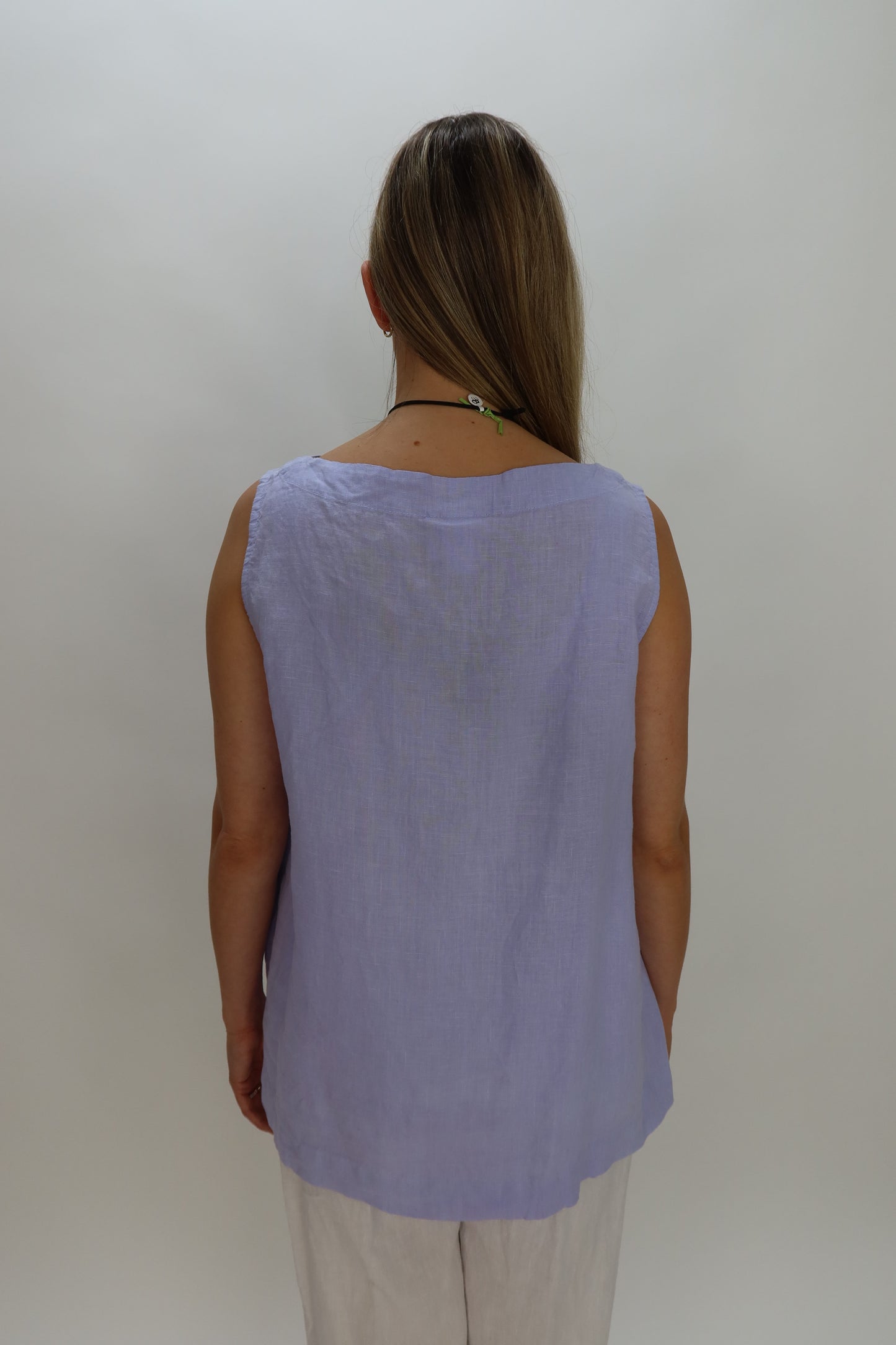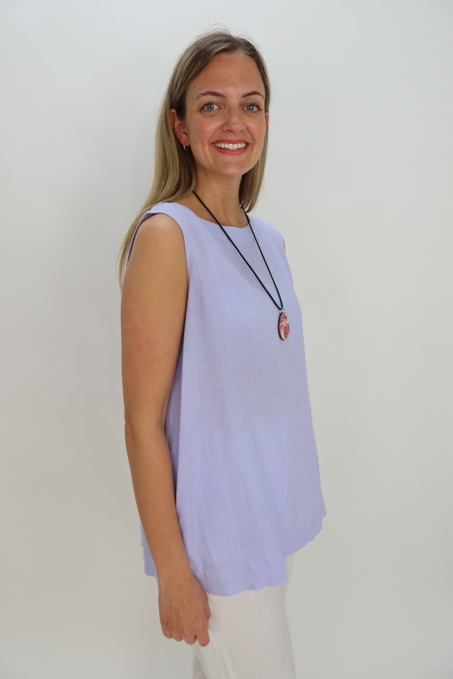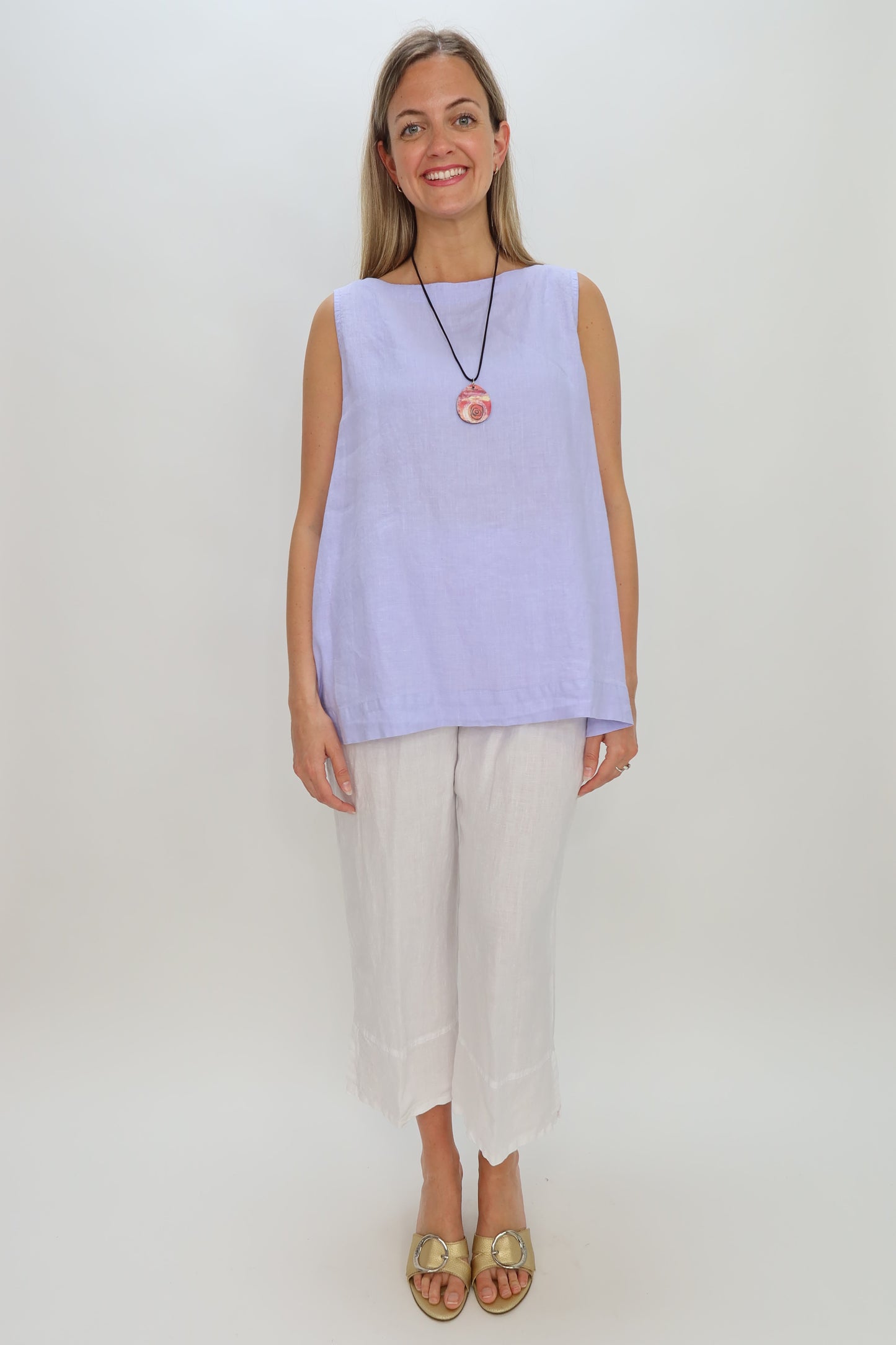Brighten your wardrobe with this lilac purple sleeveless crop tank crafted from 100% linen. Its elegant boat neck offers a sophisticated silhouette, while the vibrant color adds a playful, fresh vibe. Perfect for warm days, this breathable tank combines comfort and style effortlessly, making it a versatile piece for any casual or chic look.