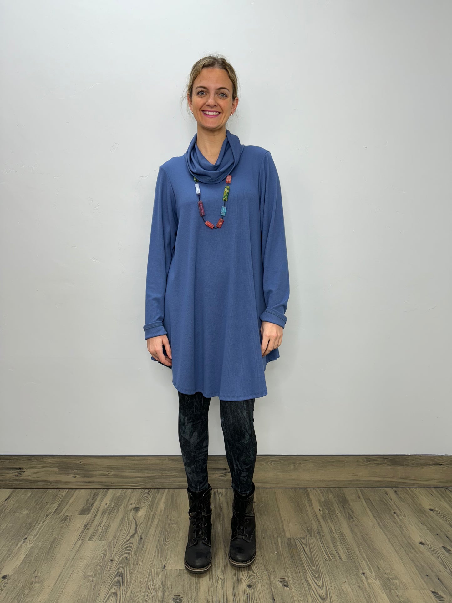 Designed by Twist Boutique owner Trish Bosman. This ribbed cowl neck tunic offers a slimming yet loose fit from the bust to waistline. It then falls to a skirt like bottom with a shirttail hemline.