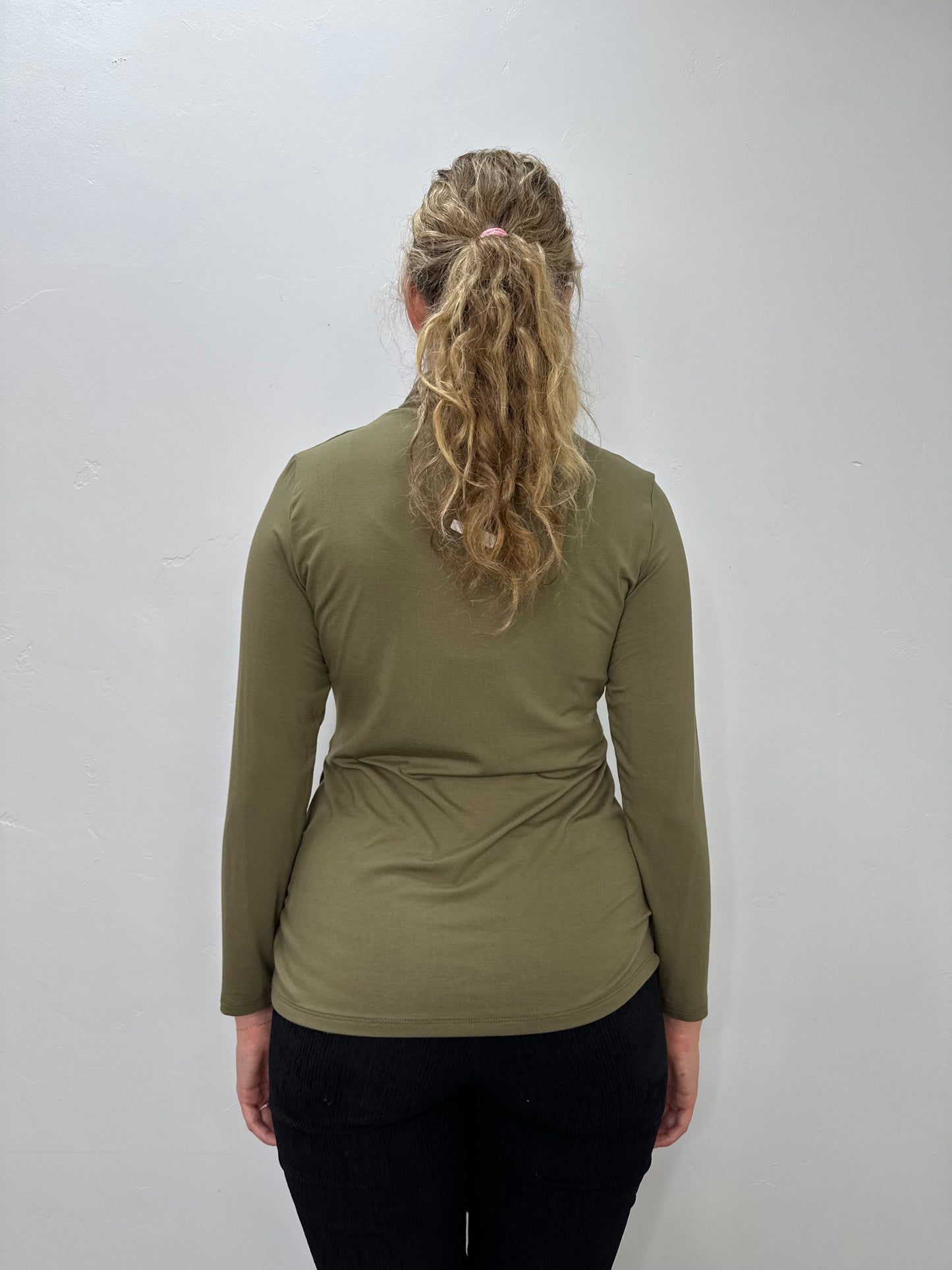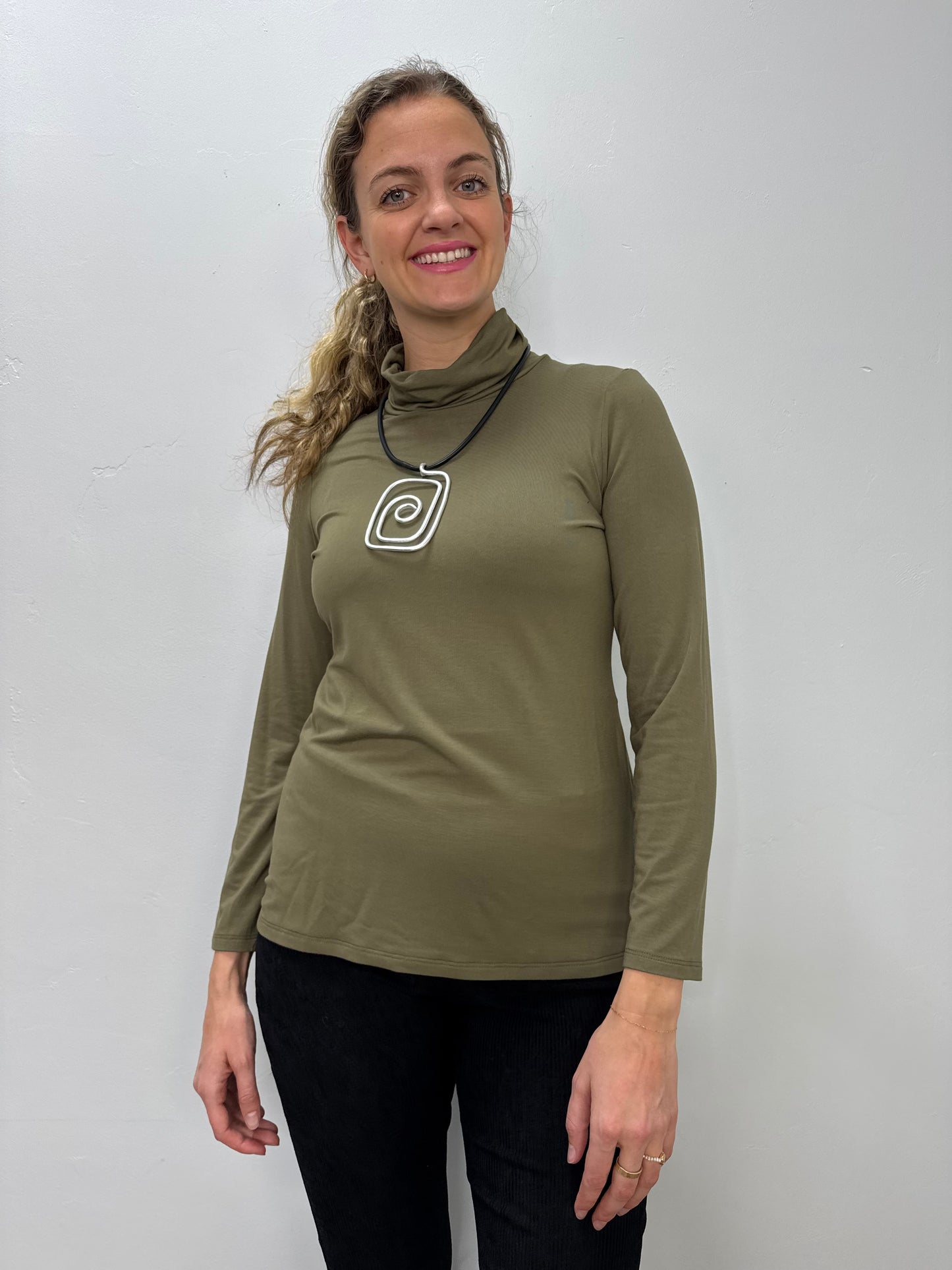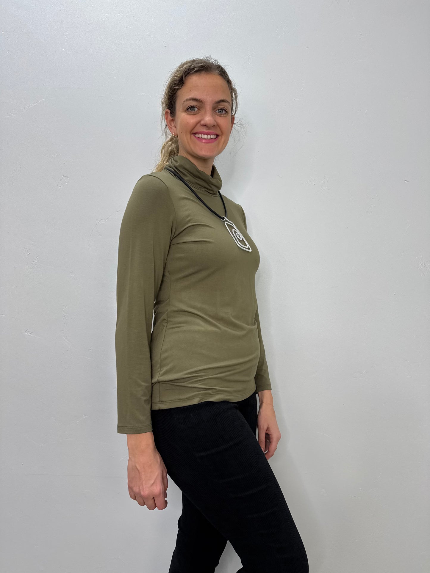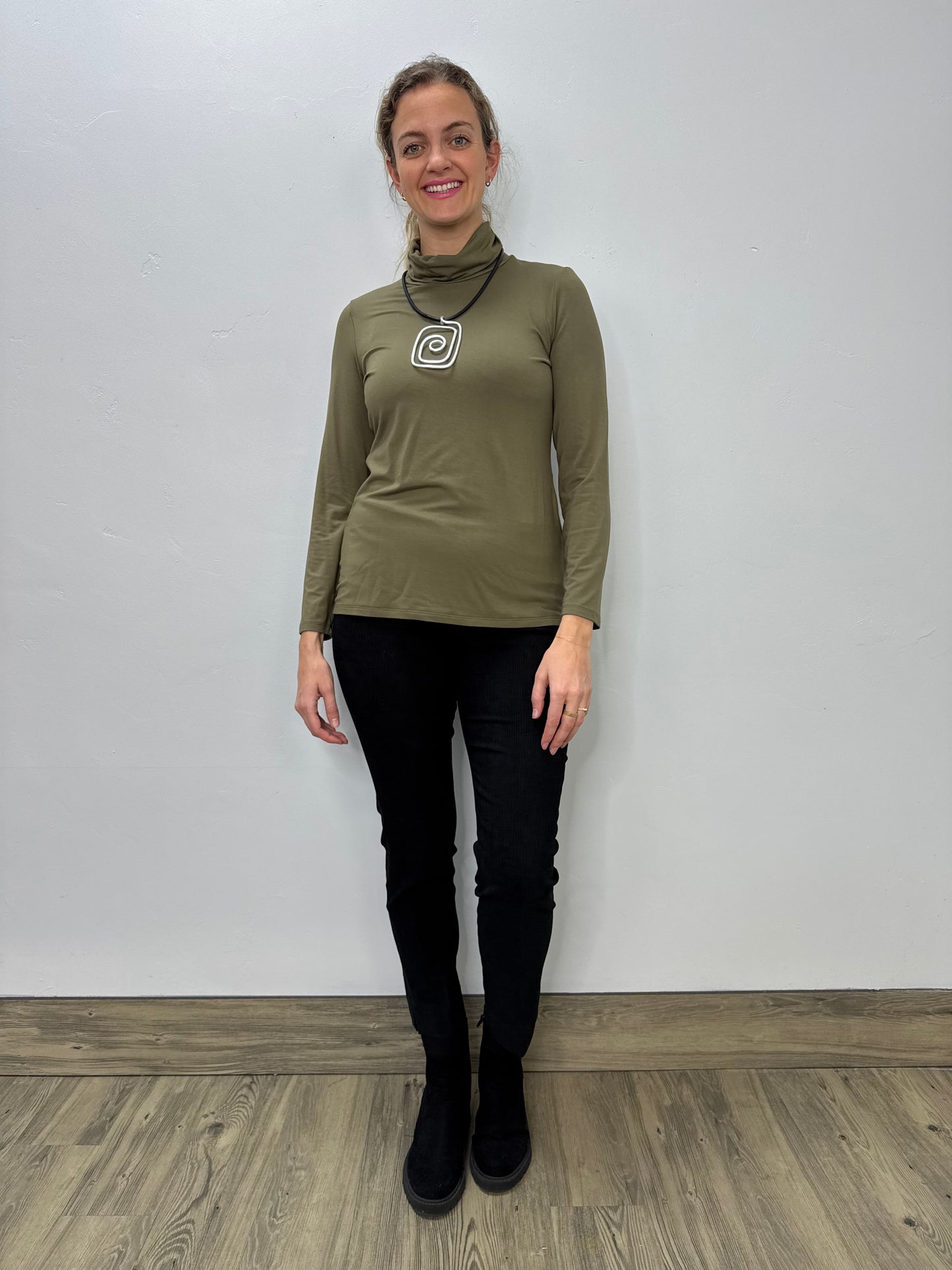 Beautiful olive long sleeve turtle neck is a very soft bamboo knit. It is perfect to wear along or to layer for a cold winter day underneath a sweater.