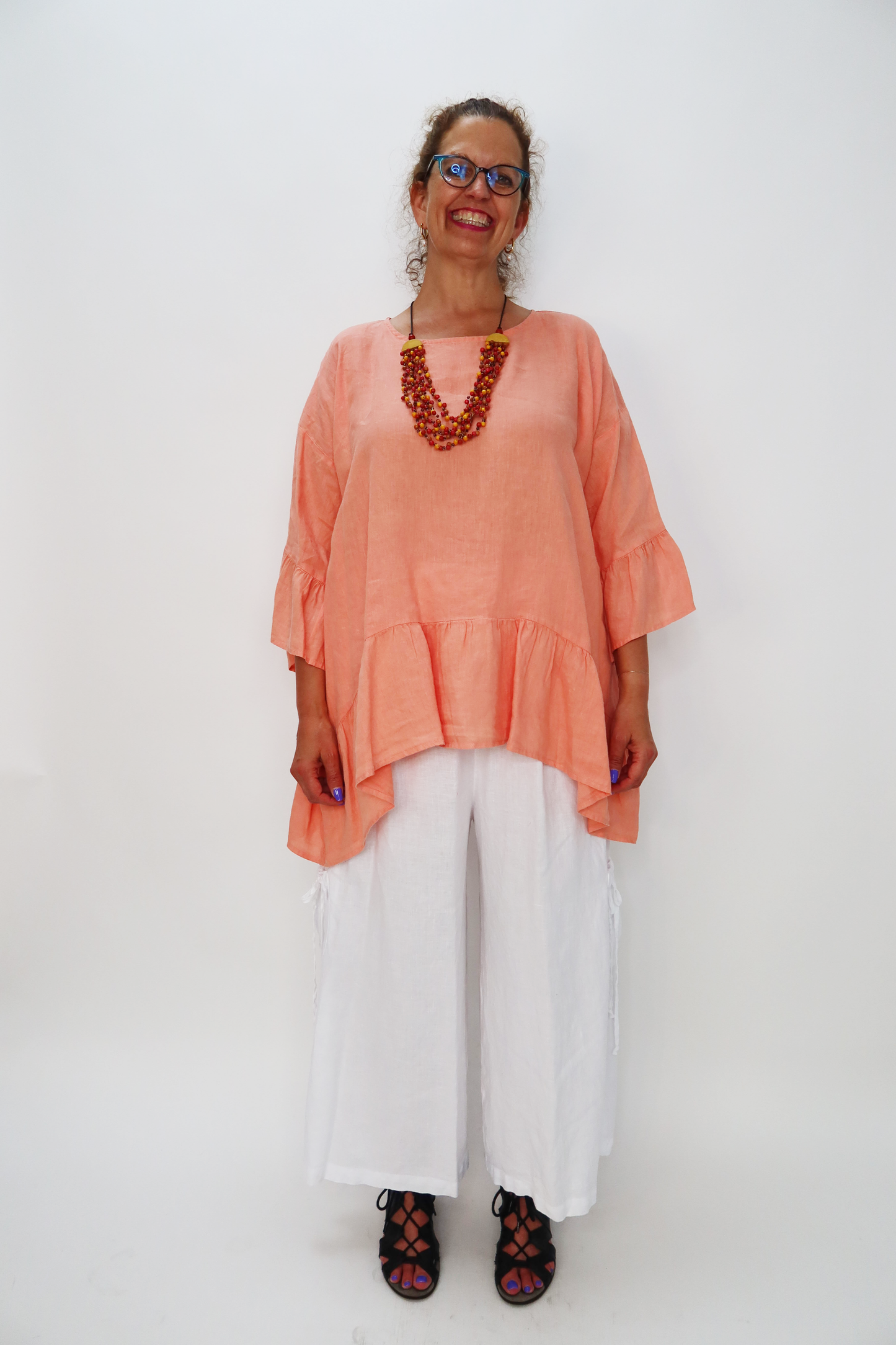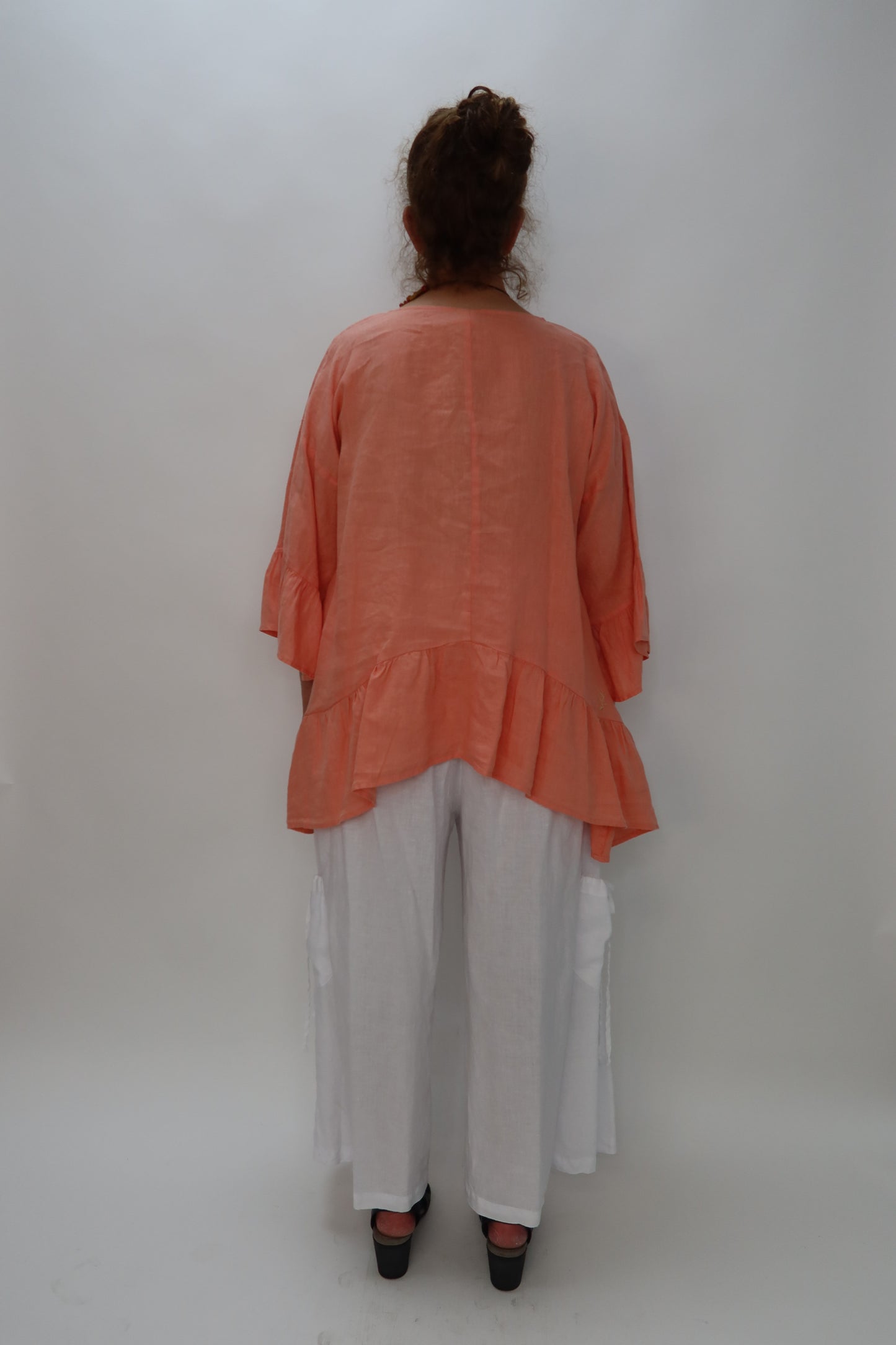 Elevate your style with this tangerine 100% linen top, featuring a ruffled shark bite hemline and flattering 3/4 sleeves. Its lightweight fabric ensures all-day comfort, while the unique hem adds a touch of playful sophistication. Perfect for adding a vibrant pop of color and effortless elegance to any outfit!