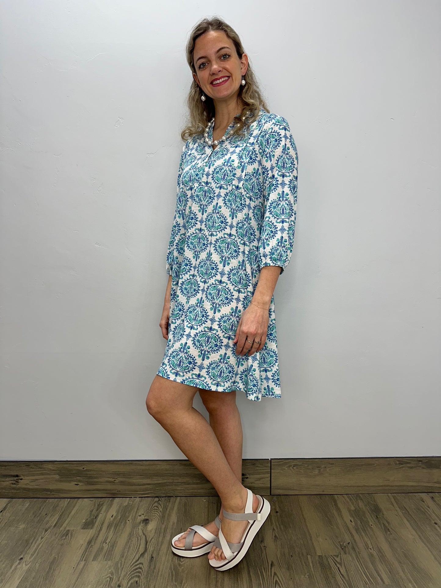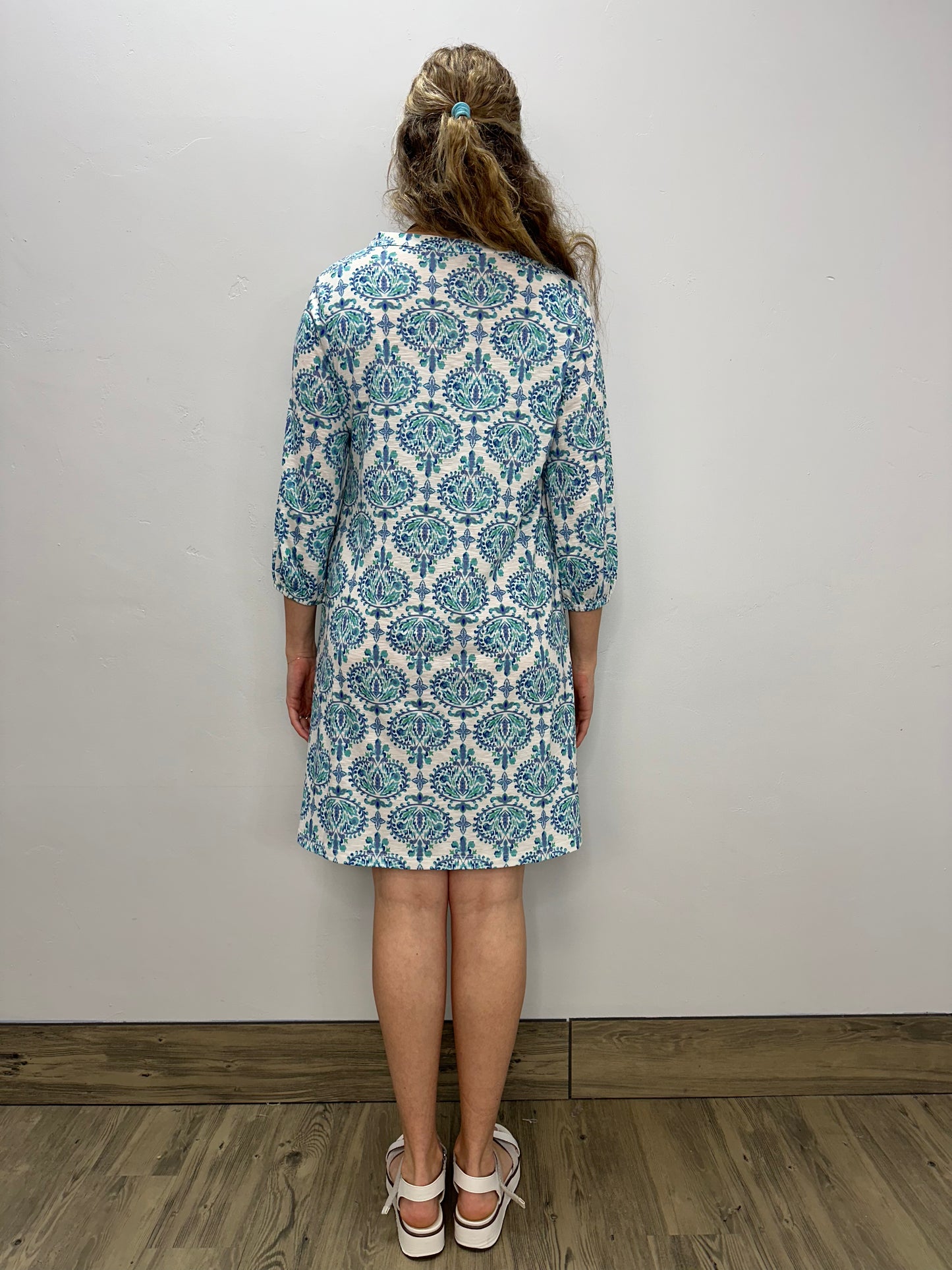 Teal and White Pattern V Neck 1/4 Button Down Dress