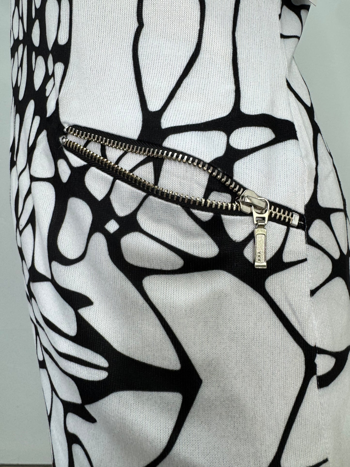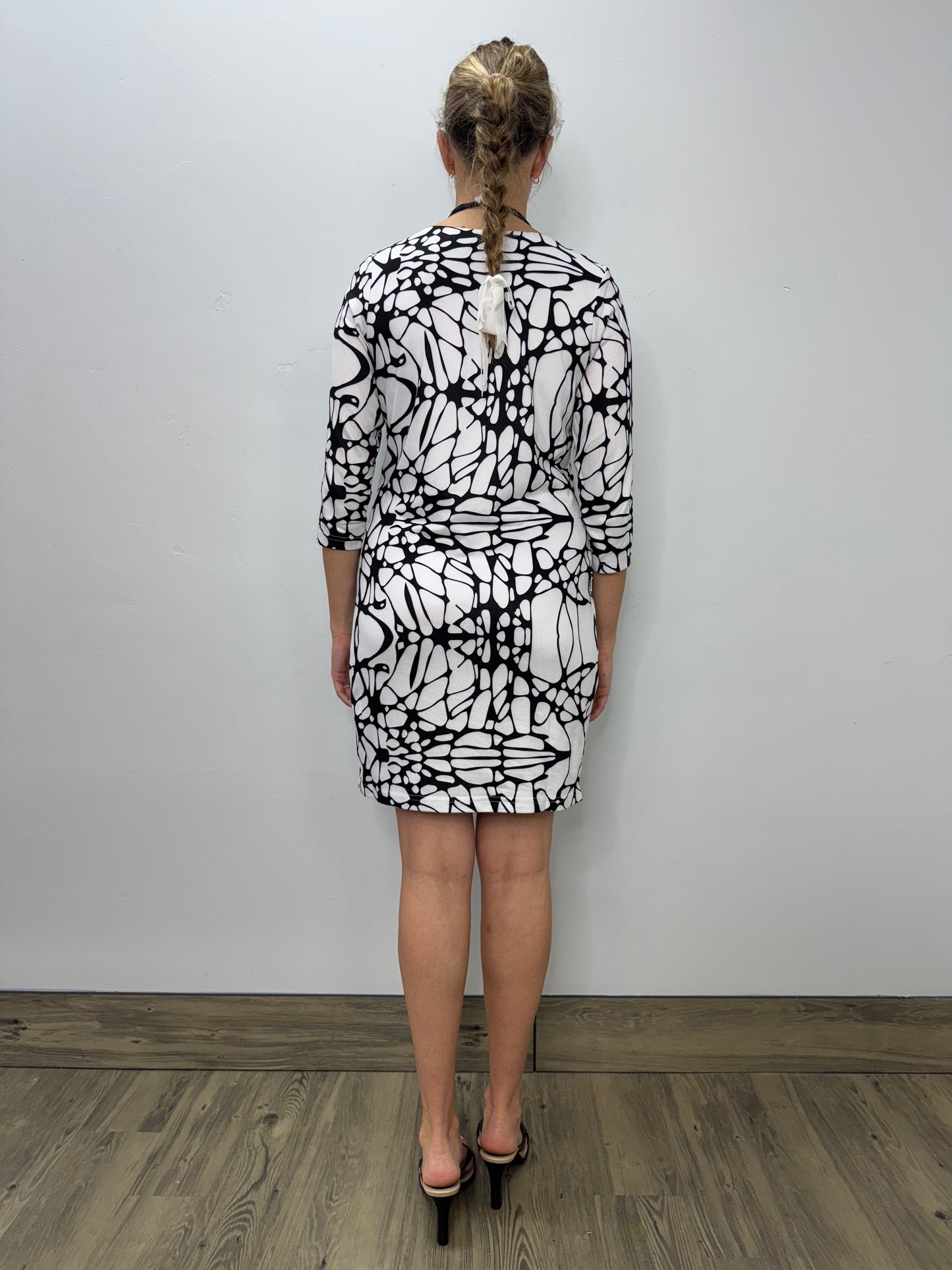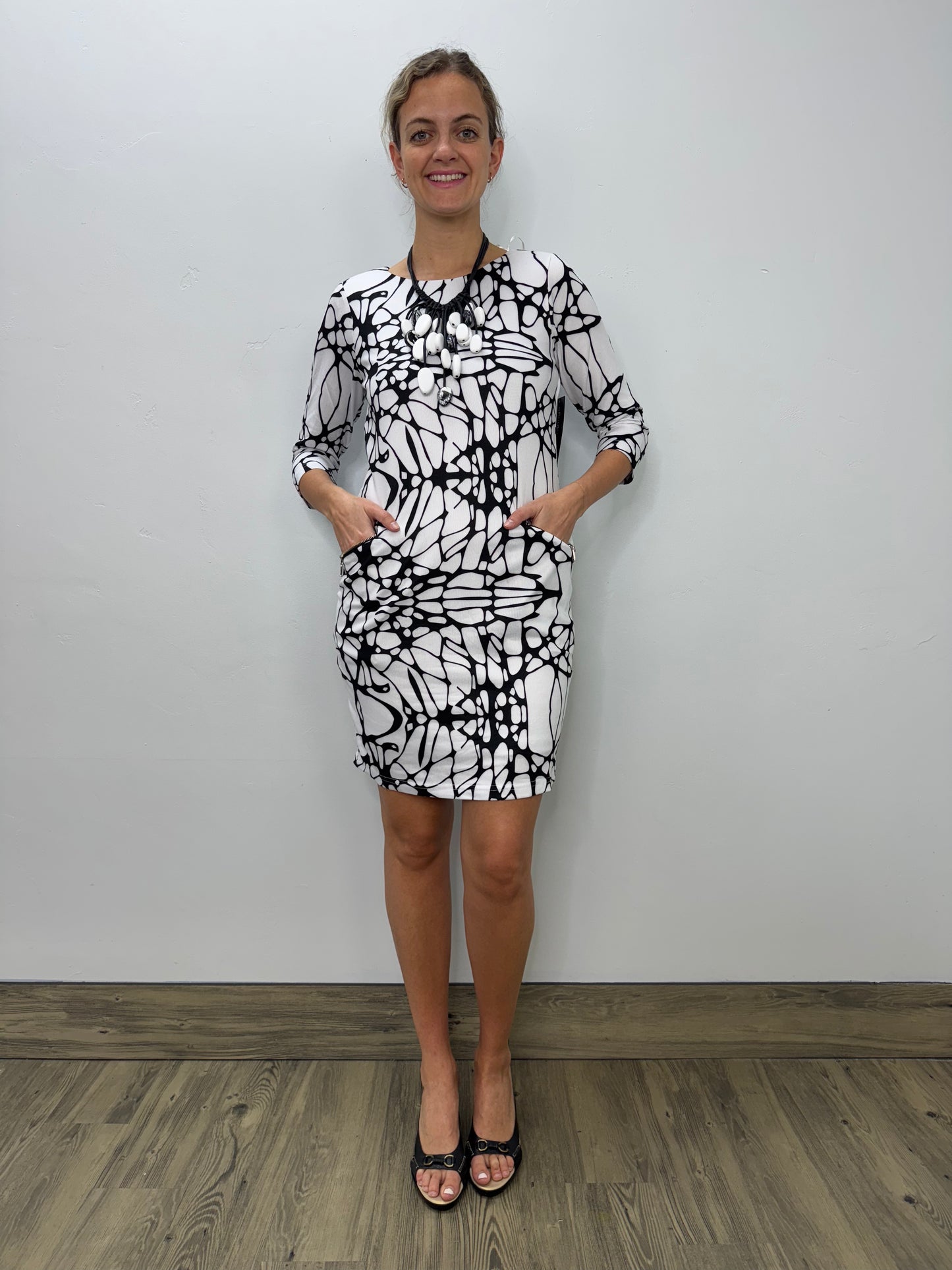 Stay warm and stylish in our Tango Mango White and Black 2 Zipper Pockets 3/4 Sleeve 2 Layer Dress. With its fun pattern and cozy double layers, this dress will make you look and feel your best. Perfect for any occasion this fall or winter, this dress is a must-have in your wardrobe!
