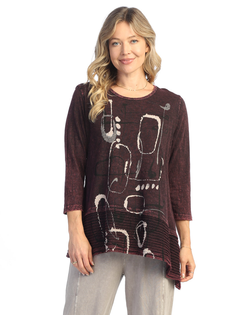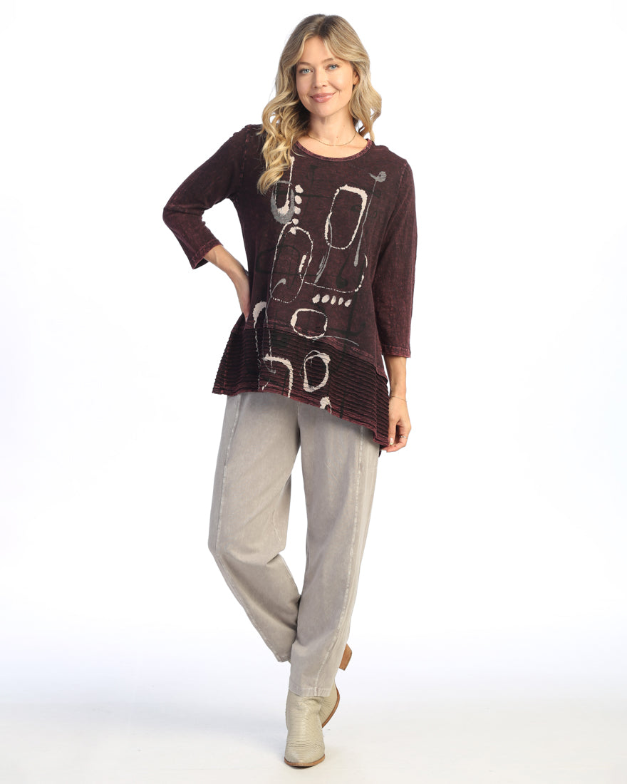 Experience effortless style and comfort with our Wine Rhythm Mineral Wash Tunic with Asymmetric Hem The wavy contrast detailing adds a unique touch to this must-have tunic. Made with 100% cotton for a soft and breathable feel.